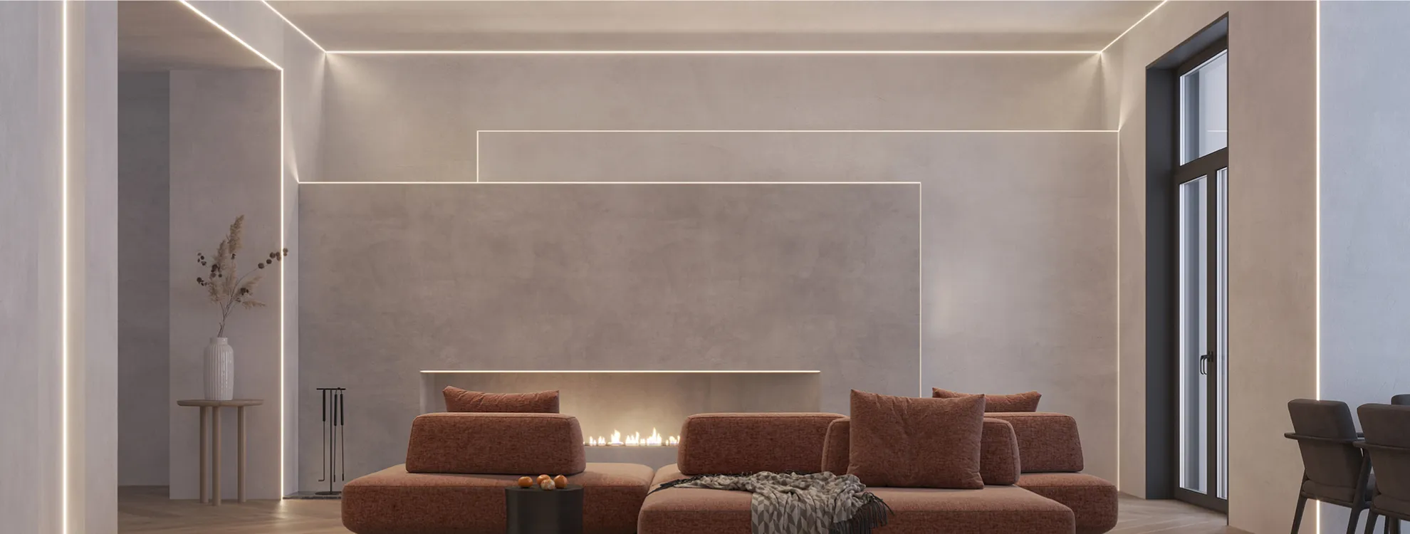 Конструкция профиля скрывается под строительной отделкой, благодаря чему видимой остается только световая линия.