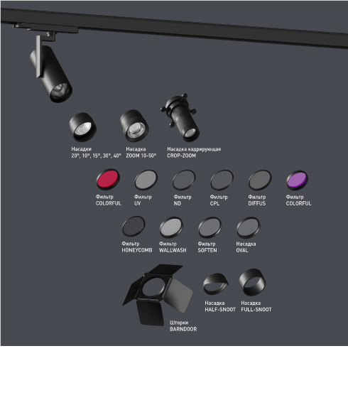 Корректирующие и антислепящие насадки Насадки с изменяемым углом 10–50° и фиксированными углами 10, 15, 30 и 40° позволяют подобрать подходящие под объект акценты; овалорисующая и кадрирующая насадки придают световому пятну различные формы; антислепящие насадки корректируют светораспределение и повышают зрительный комфорт.