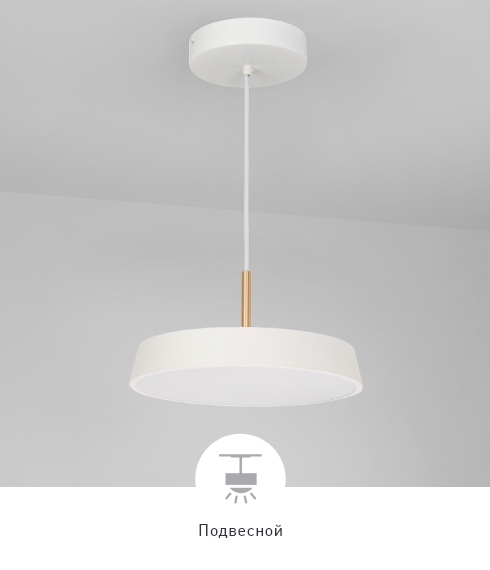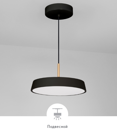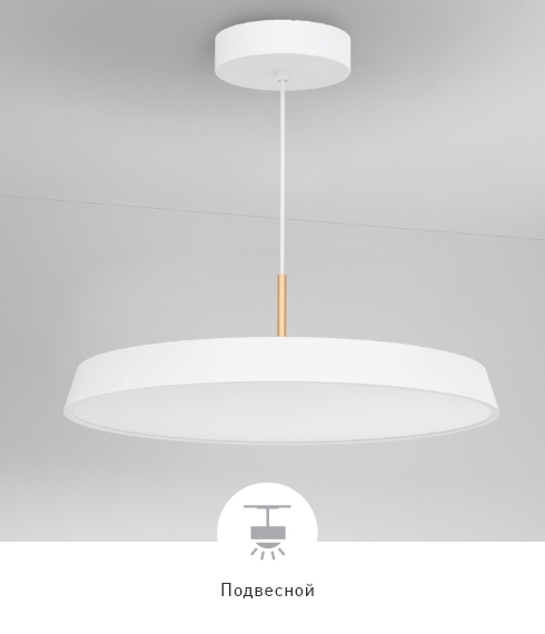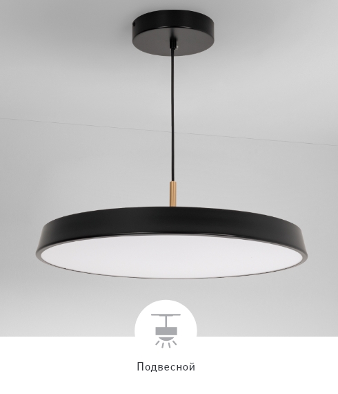 Круглые корпуса белого и черного цвета диаметром 300 и 500 мм из металла на изящном подвесе длиной 1200 мм с золотистой декоративной вставкой. Цветовая температура 3000, 4000 К. Круглые корпуса и мощностью 17 и 37 Вт.