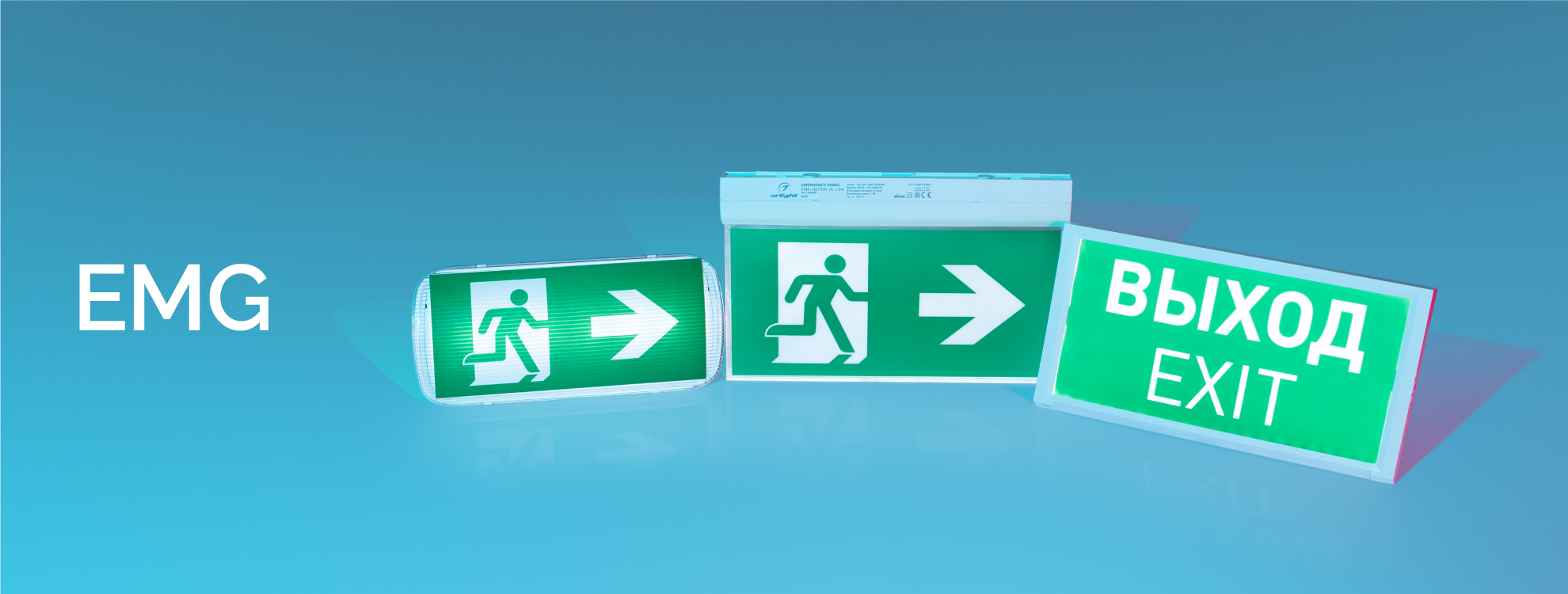 Аварийные указатели серии EMG предназначены для навигации в коммерческих и муниципальных зданиях, в том числе и в условиях отключения электроэнергии. Для всех моделей предусмотрены различные варианты пиктограмм, указывающих на путь к выходу: стрелки вверх/вниз/вправо/влево, а также надпись «Выход/Exit».