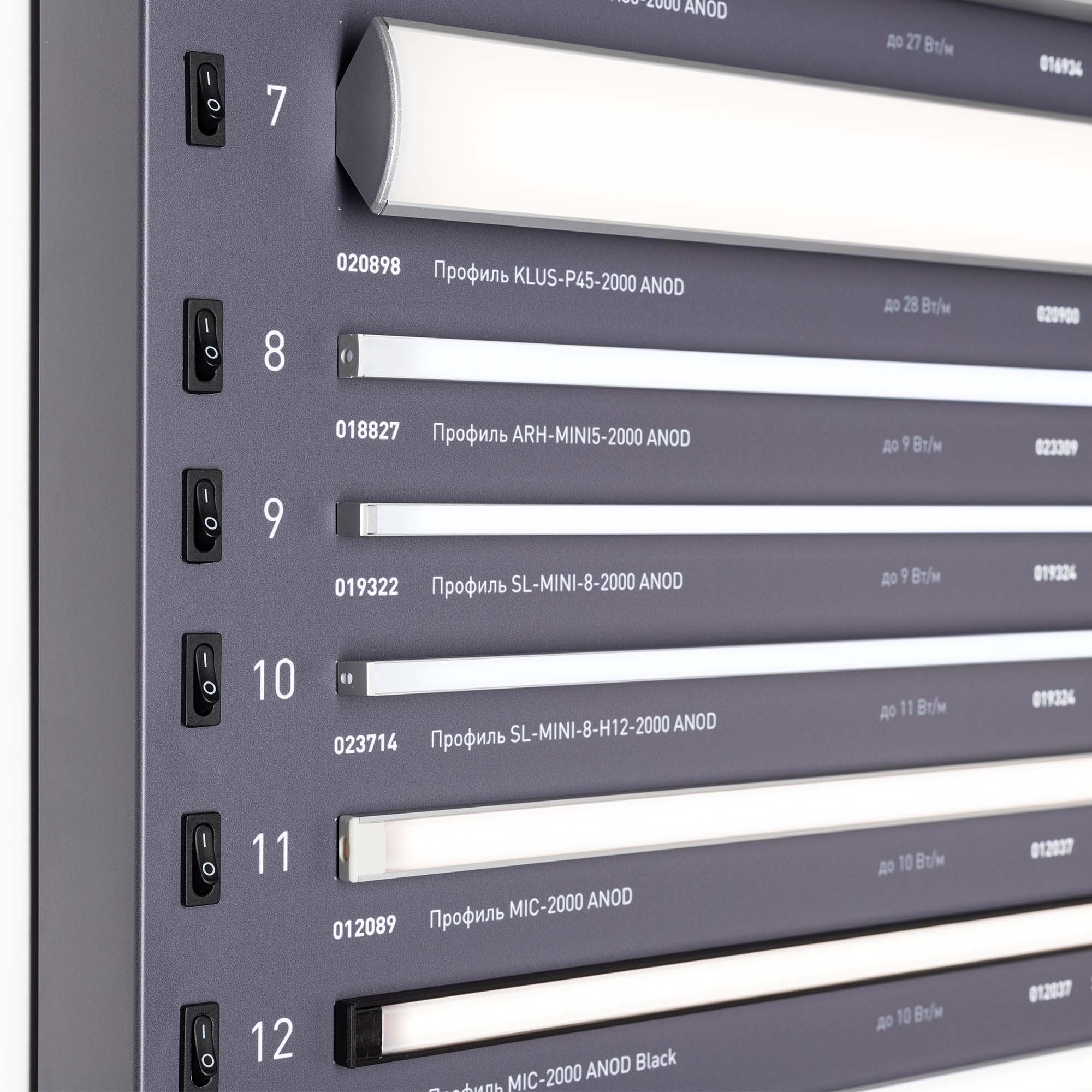 На стенде представлен ассортимент алюминиевых накладных профилей для светодиодных лент. Решения для декоративной подсветки.