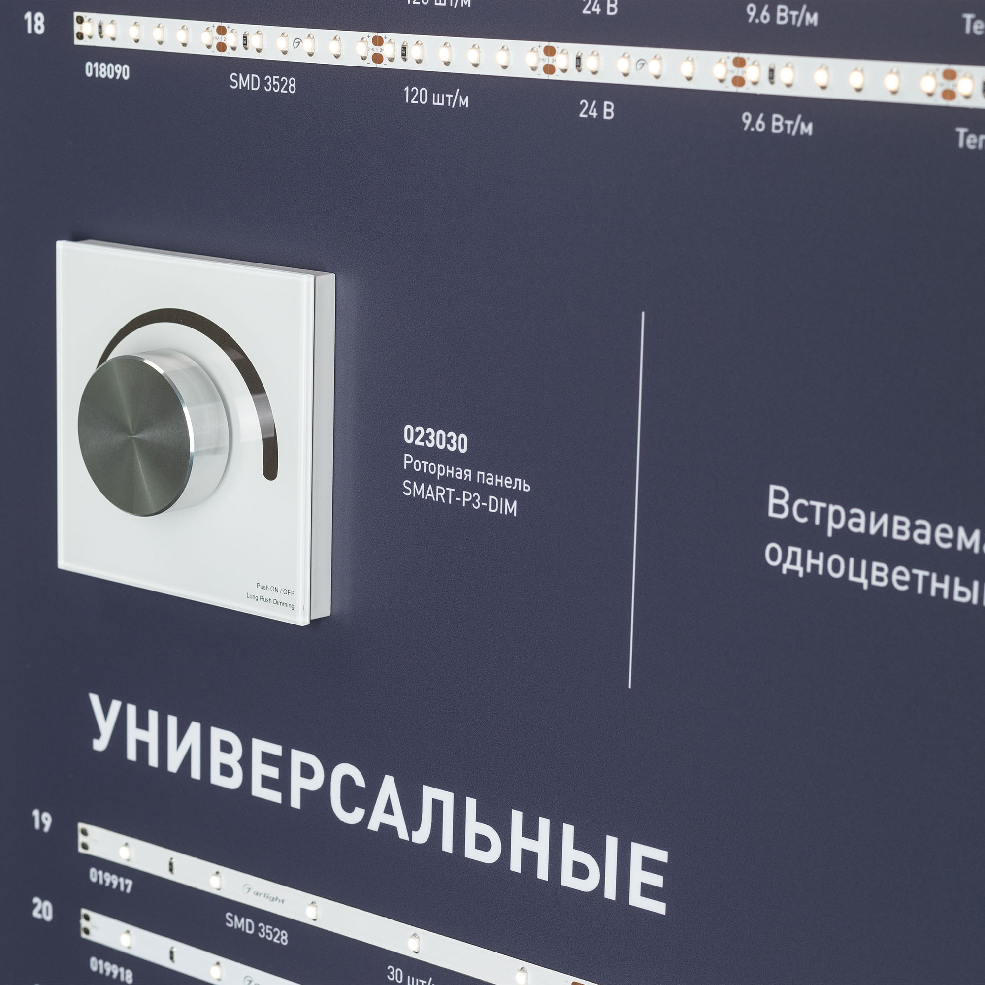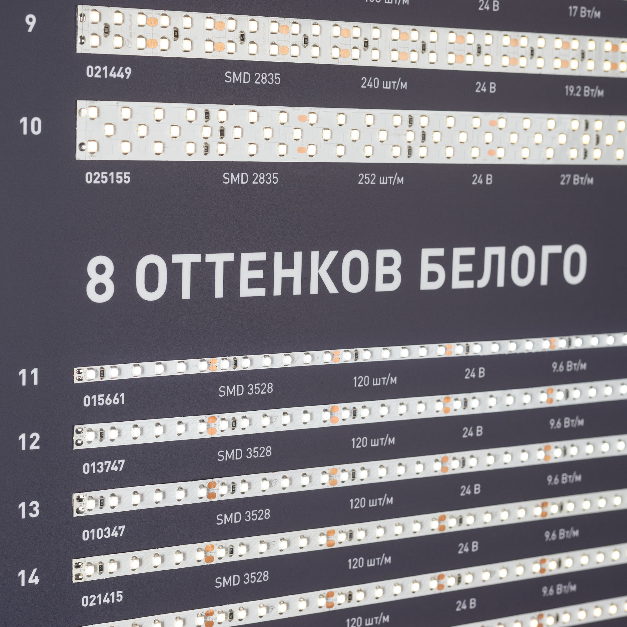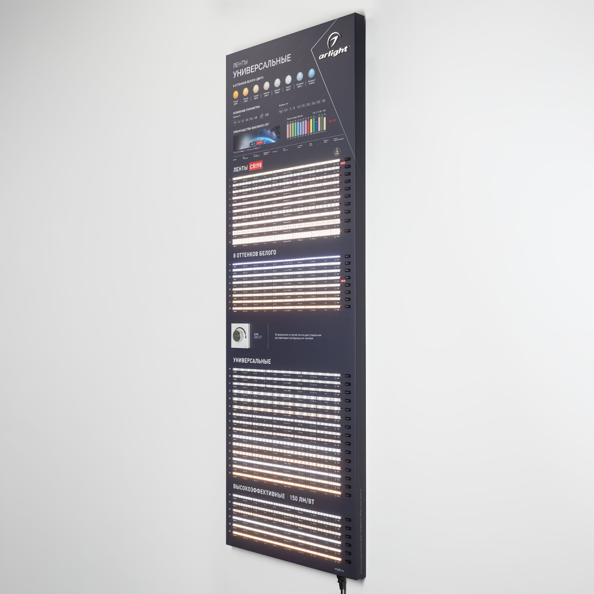 На стенде представлена классическая линейка светодиодных лент Arlight: с высокой цветопередачей (CRI>95… 98), универсальные, высокоэффективные (более 150 лм/Вт). Визуализирован имеющийся в ассортименте диапазон цветовых температур — 8 оттенков белого.