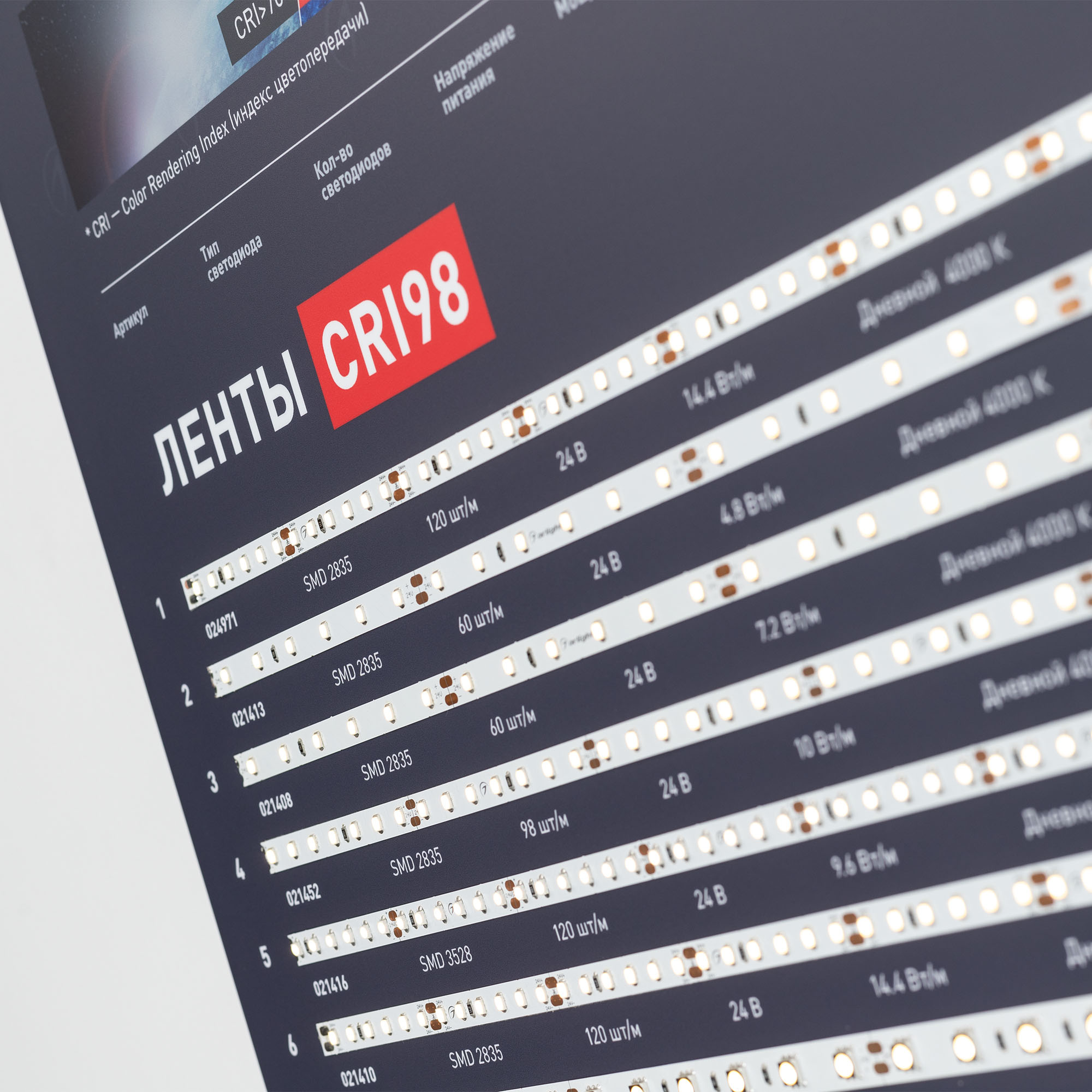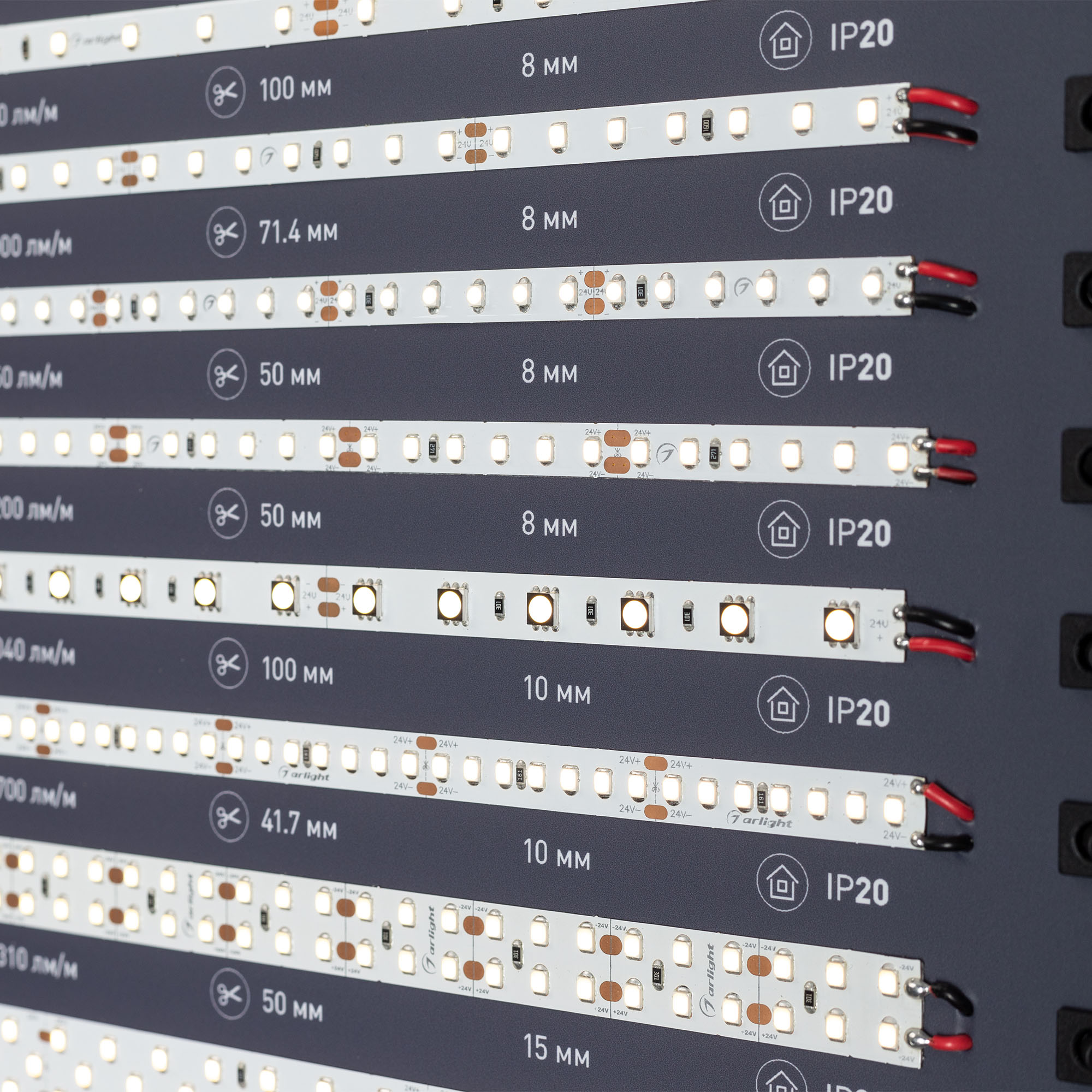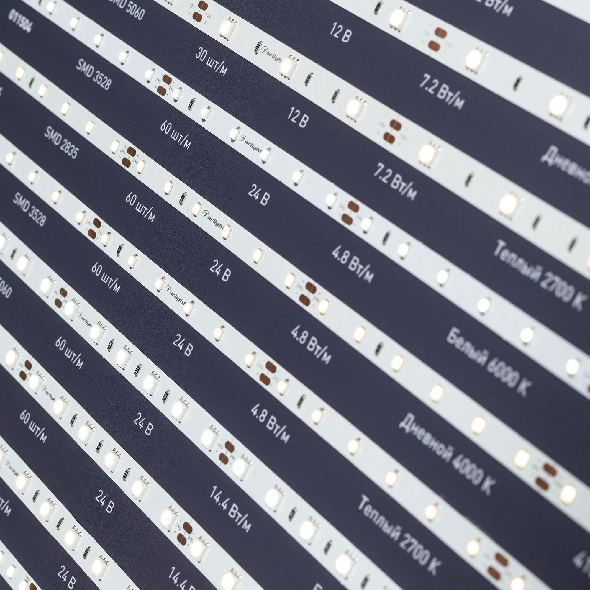 На стенде представлена классическая линейка светодиодных лент Arlight: с высокой цветопередачей (CRI>95… 98), универсальные, высокоэффективные (более 150 лм/Вт). Визуализирован имеющийся в ассортименте диапазон цветовых температур — 8 оттенков белого.