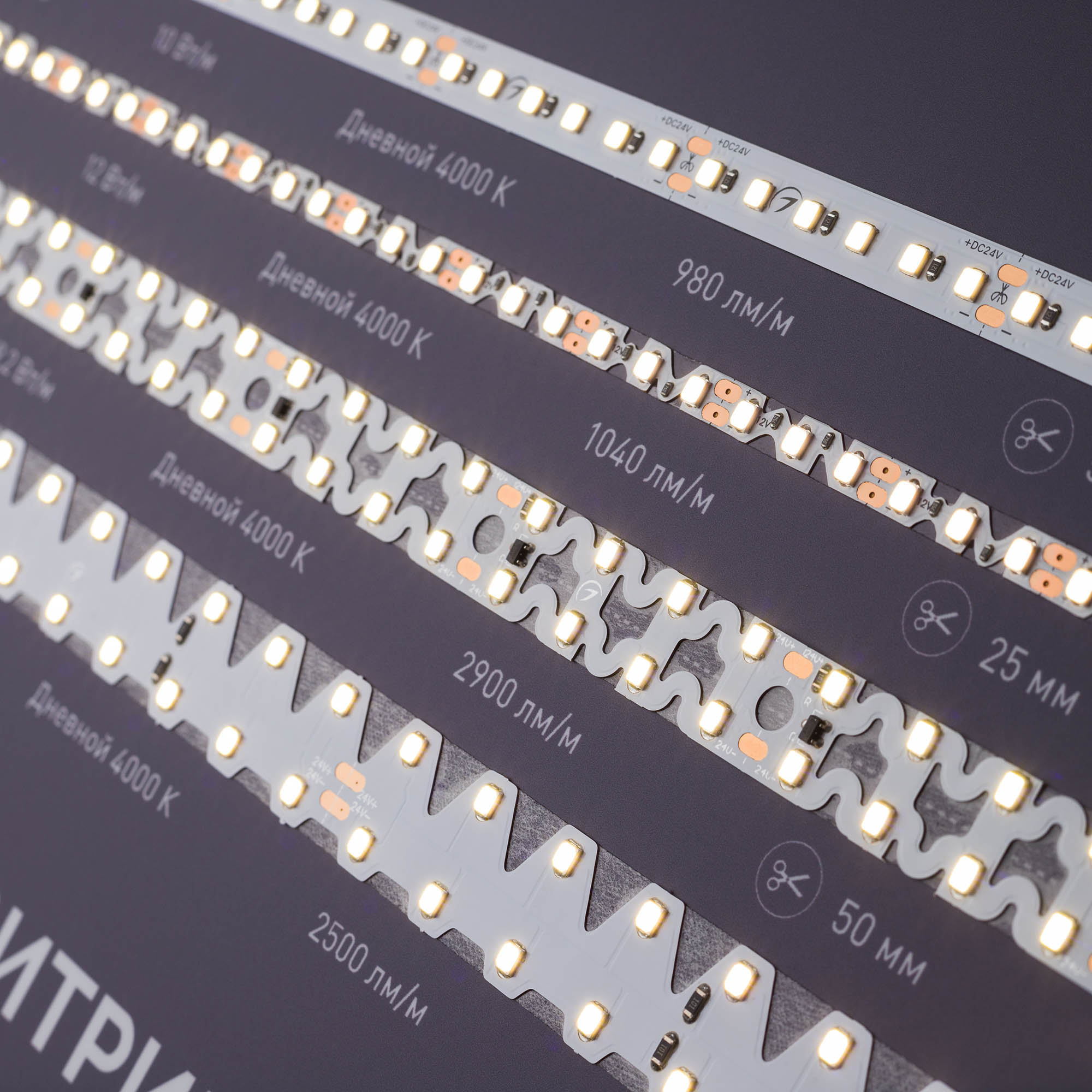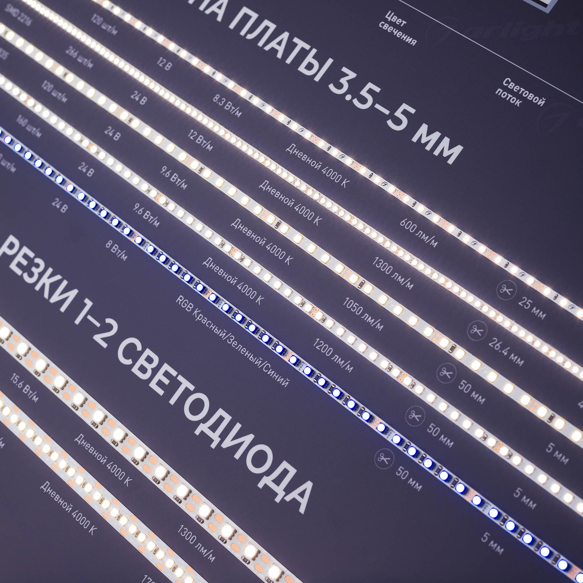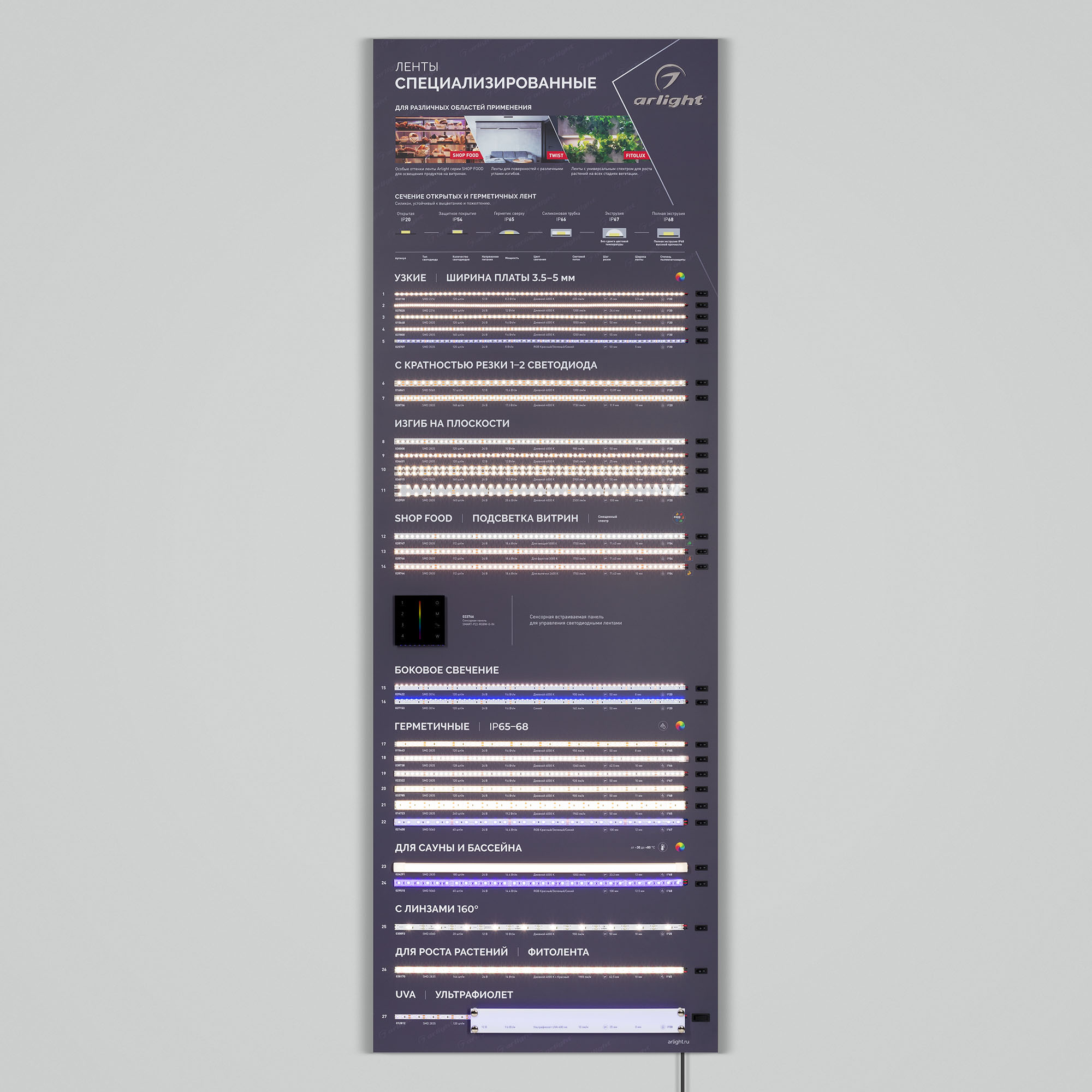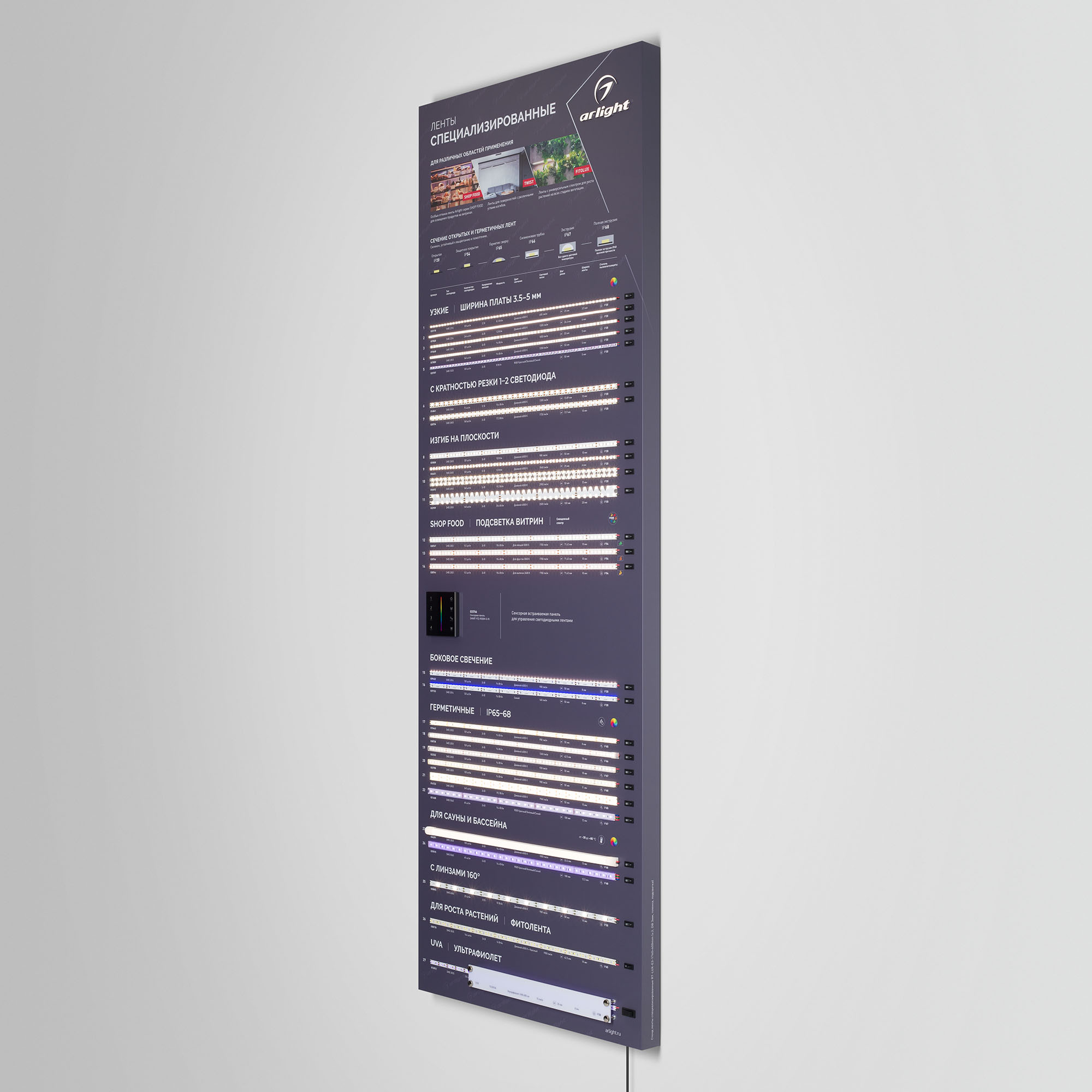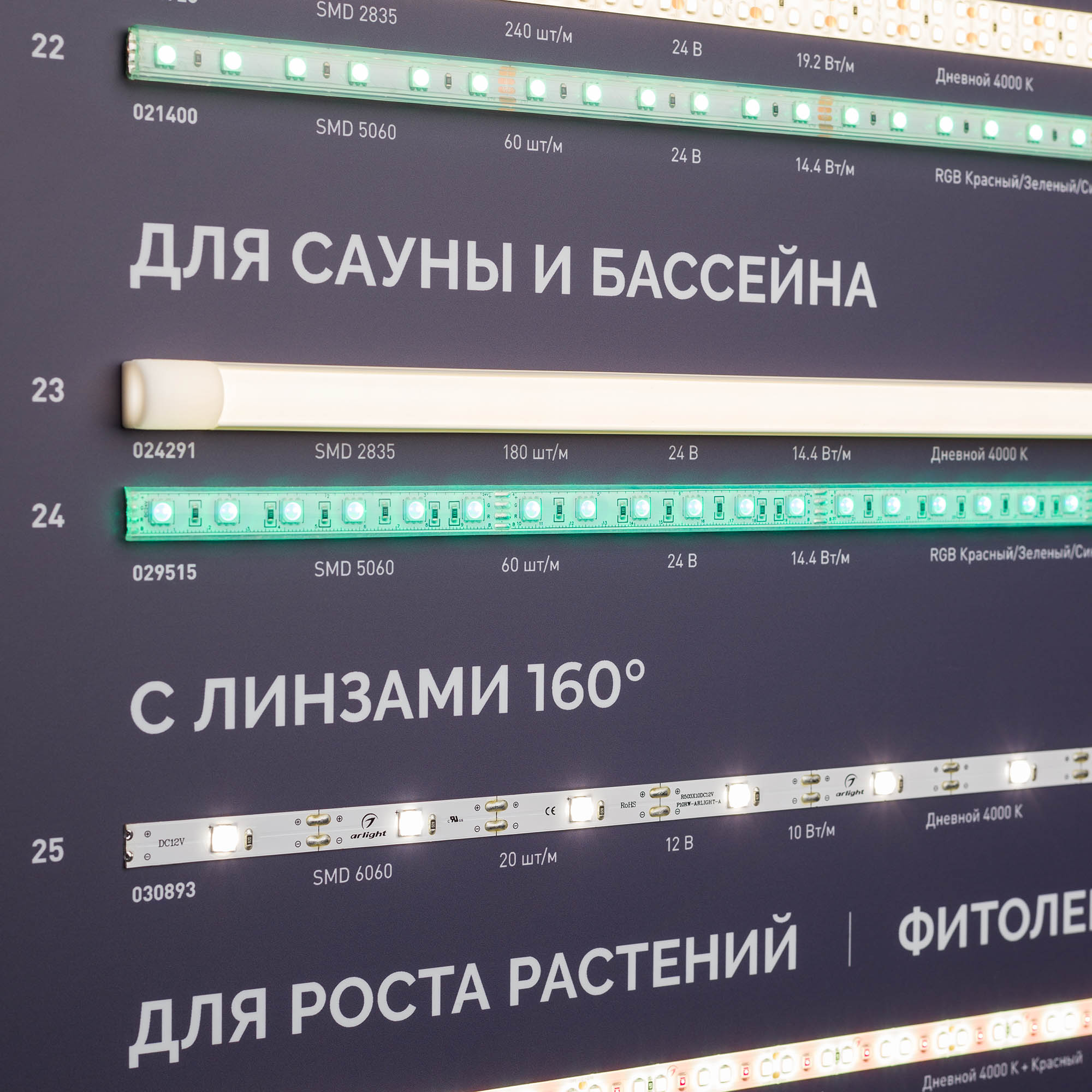 На стенде представлены ленты для решения специализированных задач освещения: узкие, с кратностью реза в 1 светодиод, стабилизированные (с подключением до 50 м), для изогнутых поверхностей, герметичные (IP65–68), для саун и бассейнов, с линзами 160°, для подсветки витрин (со смещенным спектром, продуктовая линейка), UVA (ультрафиолет).