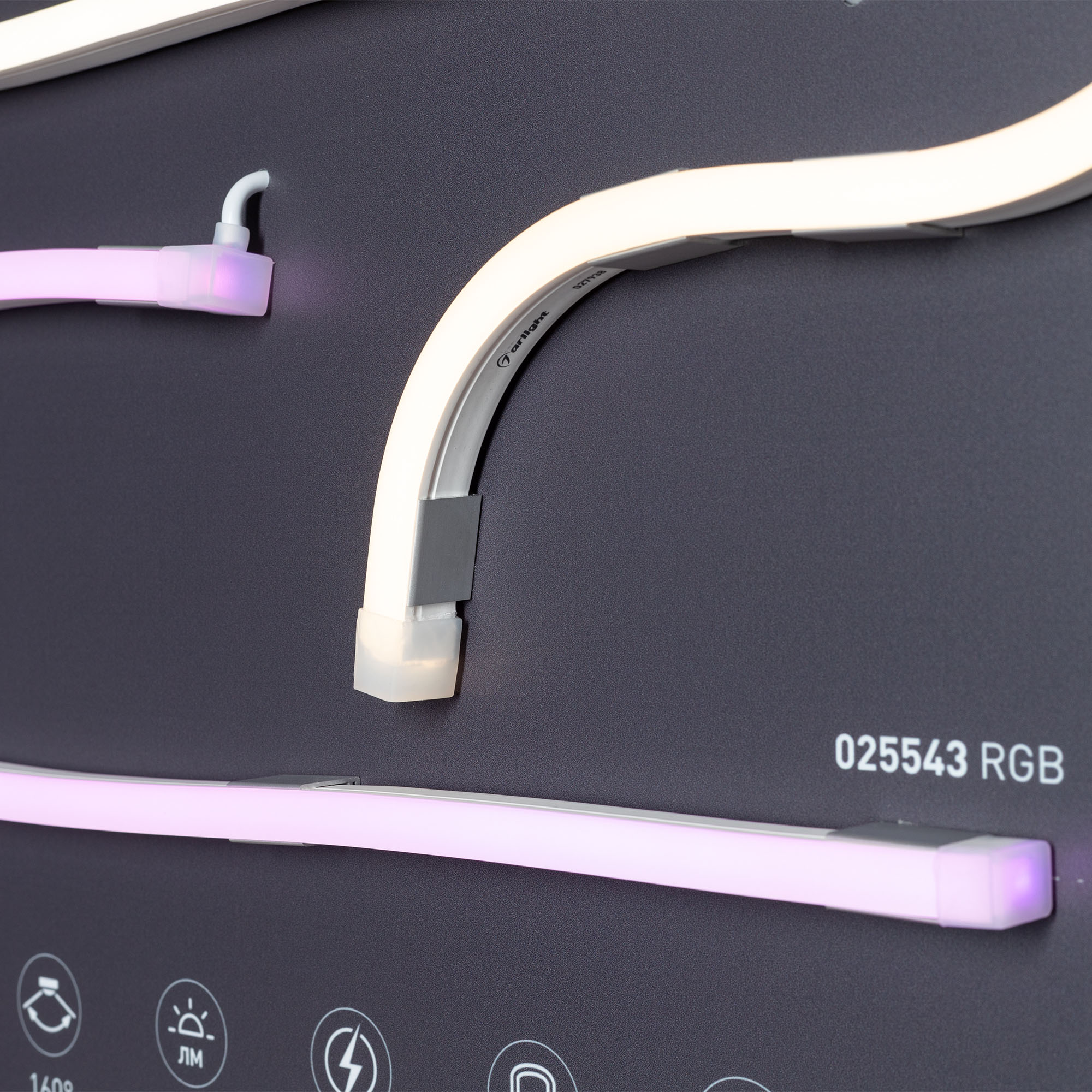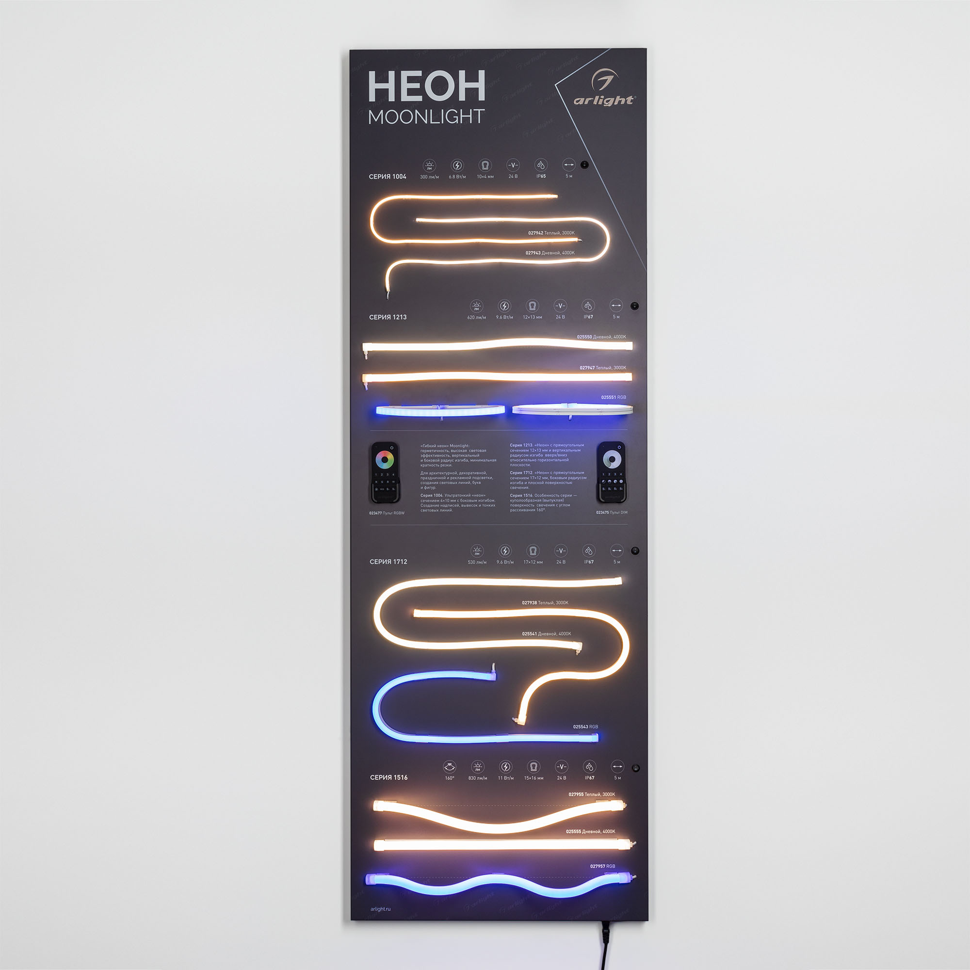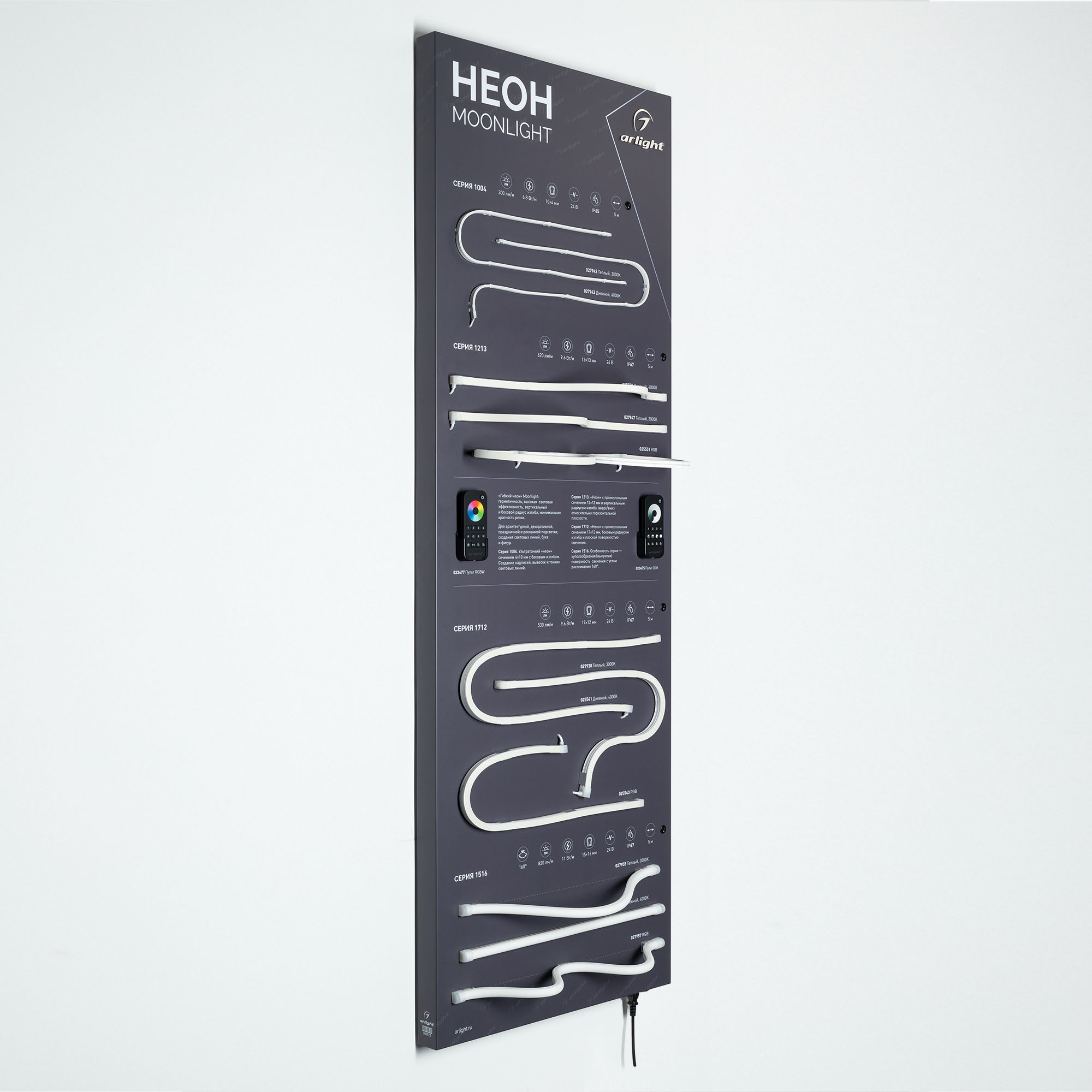 На стенде представлен светодиодный гибкий неон серии MOONLIGHT. Модели различных типоразмеров и цветов, боковой и вертикальный изгиб, прямоугольное и куполообразное сечение, а также модели RGB с возможностью ручной регулировки цвета.