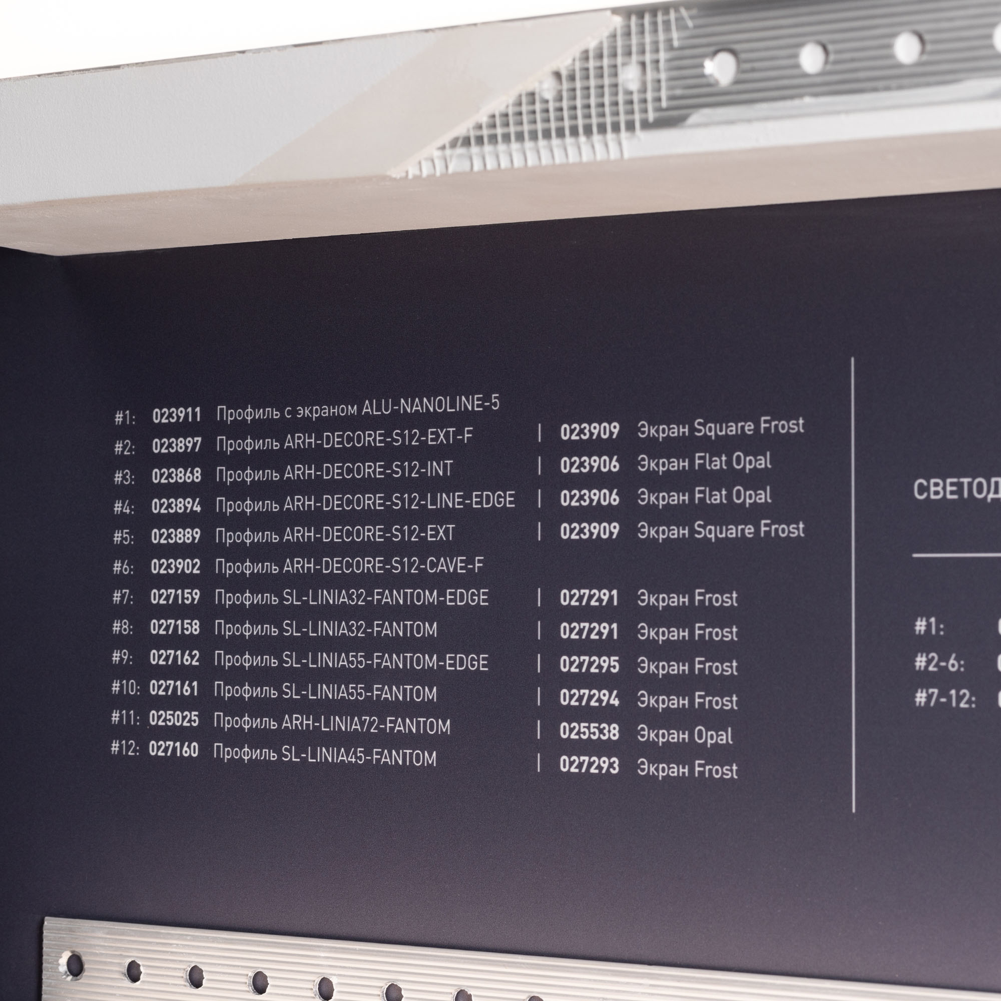 На стенде представлены профили серии DECORE и FANTOM. Размер 1760х600 мм