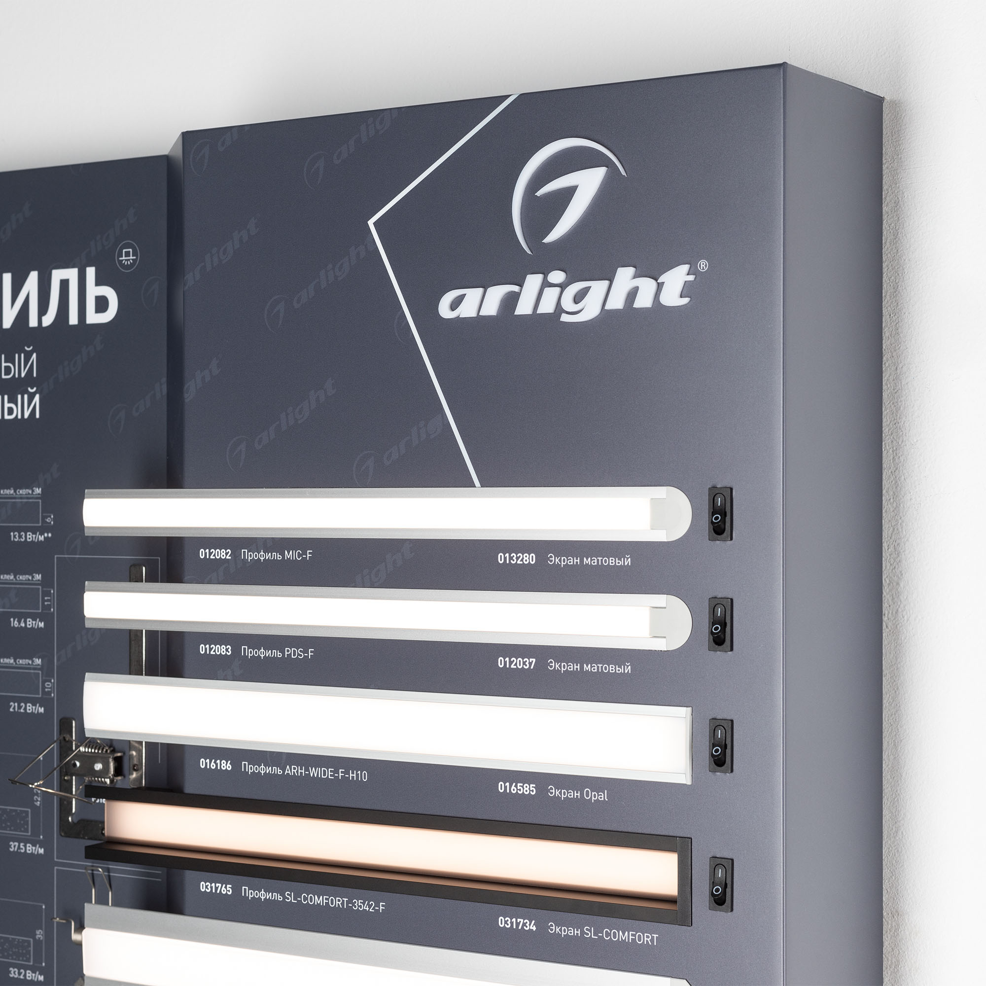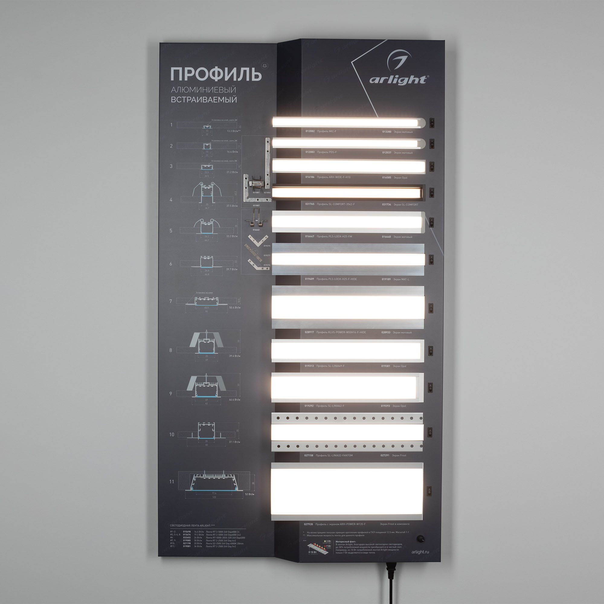 На стенде представлен ассортимент алюминиевых встраиваемых профилей для светодиодных лент для основного и декоративного освещения.