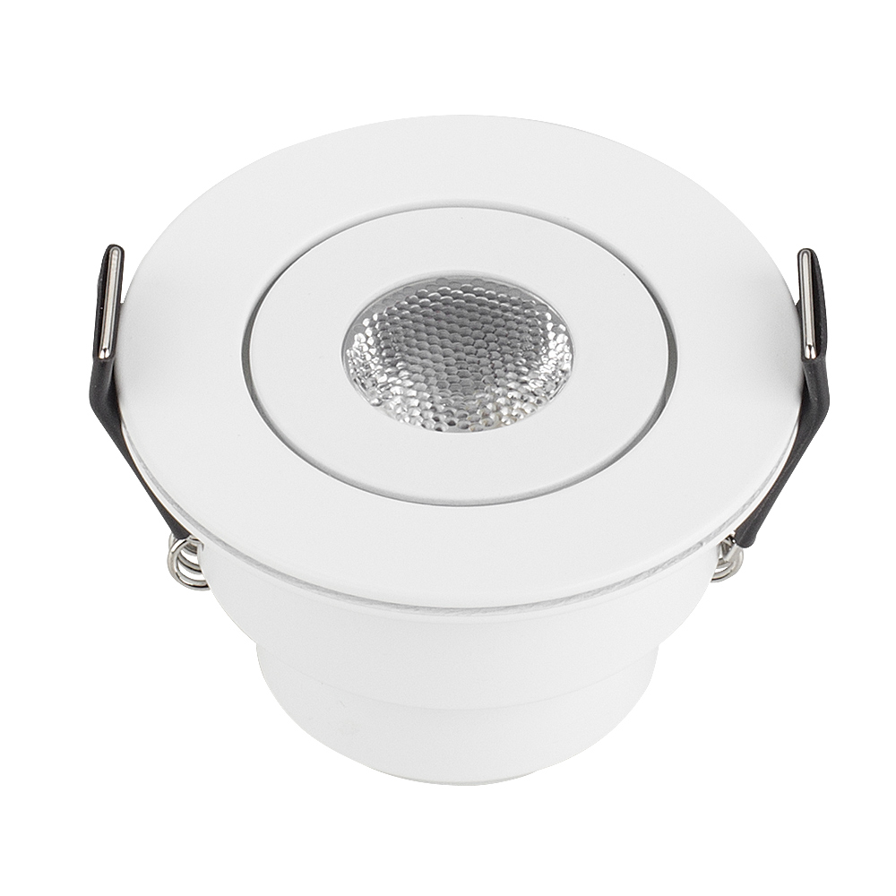 Врезной круглый мебельный светильник 3Вт, корпус белый алюминий. Цвет ДНЕВНОЙ БЕЛЫЙ 4000-4500K. Светодиод 1х3W CREE XPE. Св.поток 140-160лм, наклоняемая ось, угол 30°. Питание 180-240VAC, 3Вт, 700mA 3-5V, драйвер в комплекте. Размеры d52x43 мм, врезное отверстие d45 мм.