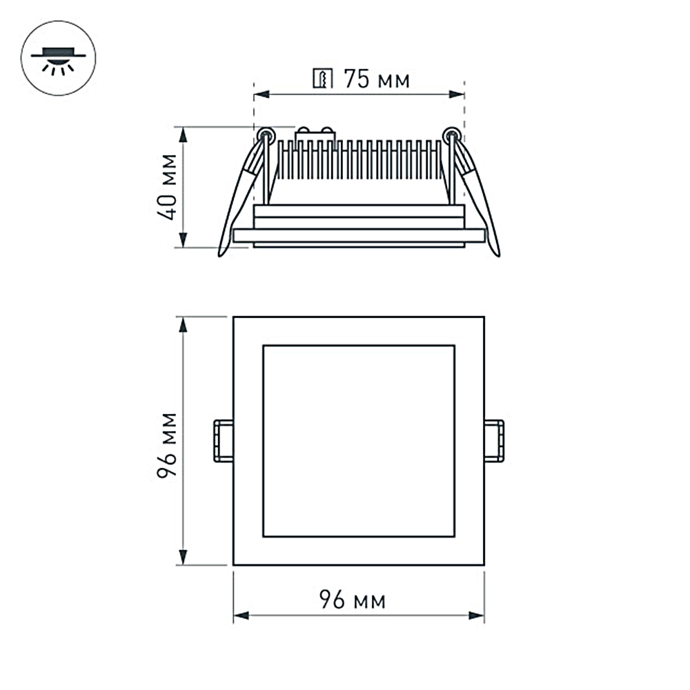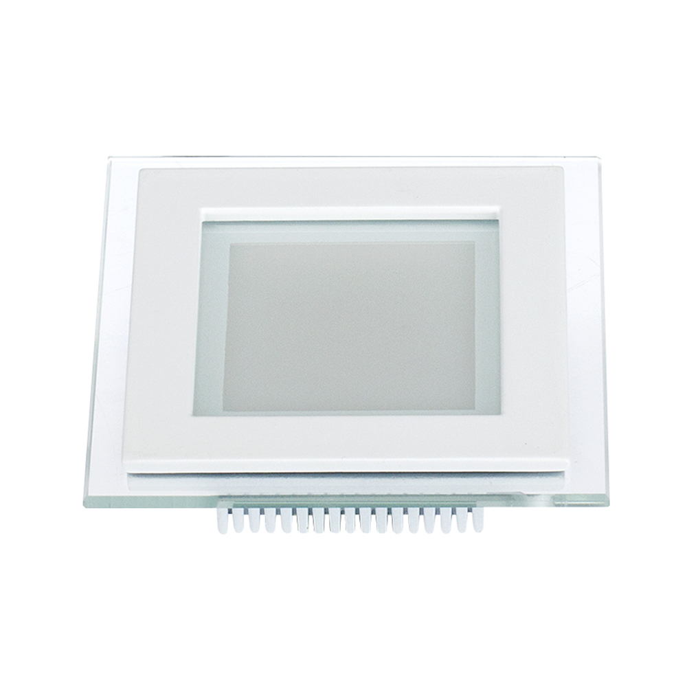 Стеклянная квадратная панель 6Вт / ДНЕВНОЙ 4000-4500K / 430лм / 120°. Размер 96x96x40мм (в отверстие 75x75мм). Корпус белый. Питание от сети 230VAC, драйвер в комлекте 300mA 15-25V. Диапазон рабочих температур -10°..+40°C. Для помещений.