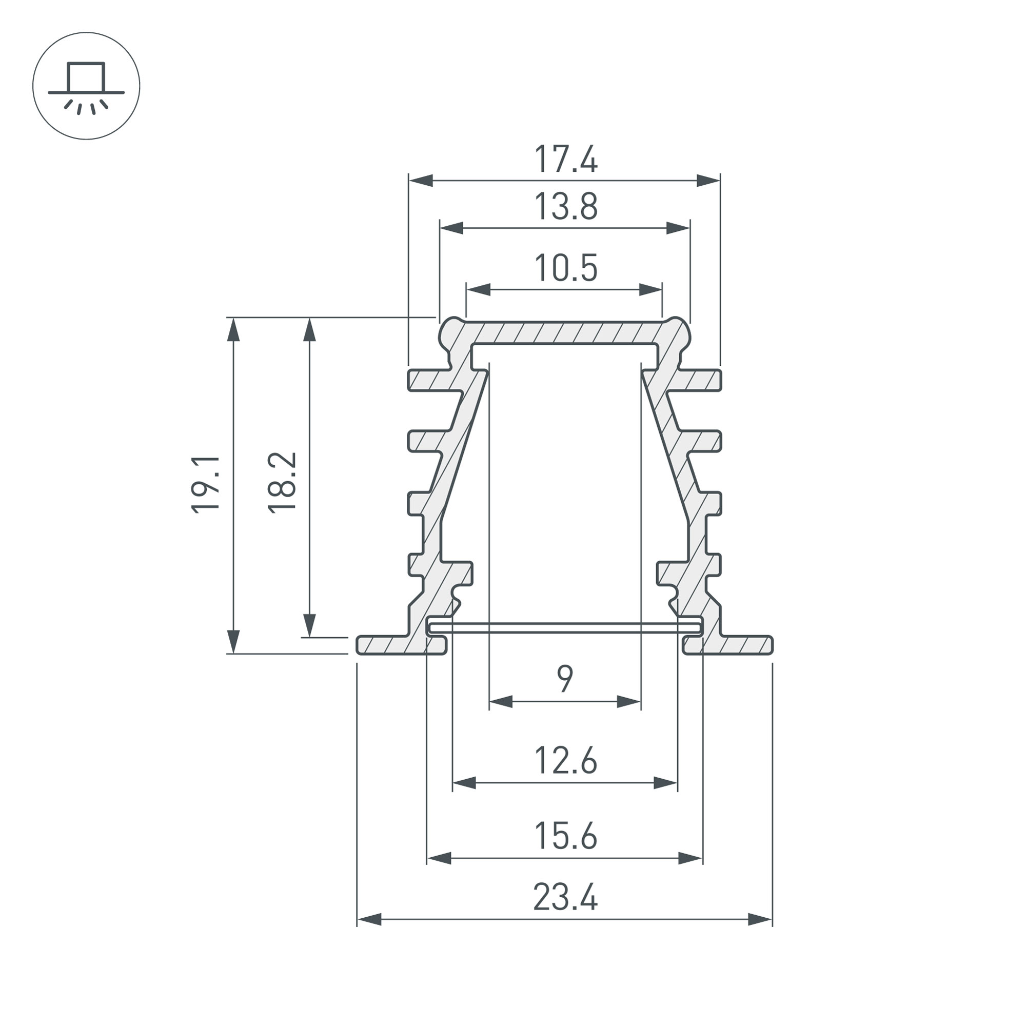 Алюминиевый анодированный встраиваемый профиль для светодиодных лент и линеек. Габаритные размеры (L×W×H): 2000x23,4x19,1 мм. Ширина площадки для ленты 9 мм. Экраны, заглушки и другие аксессуары приобретаются отдельно. Цена за 1 метр.