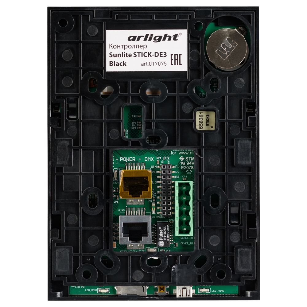 Настенный DMX512 контроллер SUNLITE DE3 в виде встаиваемой панели для формирования управляющего сигнала для декодеров DMX512. Сенсорное управление, 20 кнопок, 500 сцен (программ), 10 зон, 1024 канала. Контроллер оснащен разъемами USB/Ethernet. Поддерживает ПО ESA+ESA2+ESA Pro software, имеет слот microSD для использования карт с заранее написанными программами. Питание контроллера 230В. Габариты составляют 106х146х11мм, стеклянное покрытие чёрного цвета. В комплекте: контроллер, блок питания, карта памяти, кабель USB, паспорт изделия.