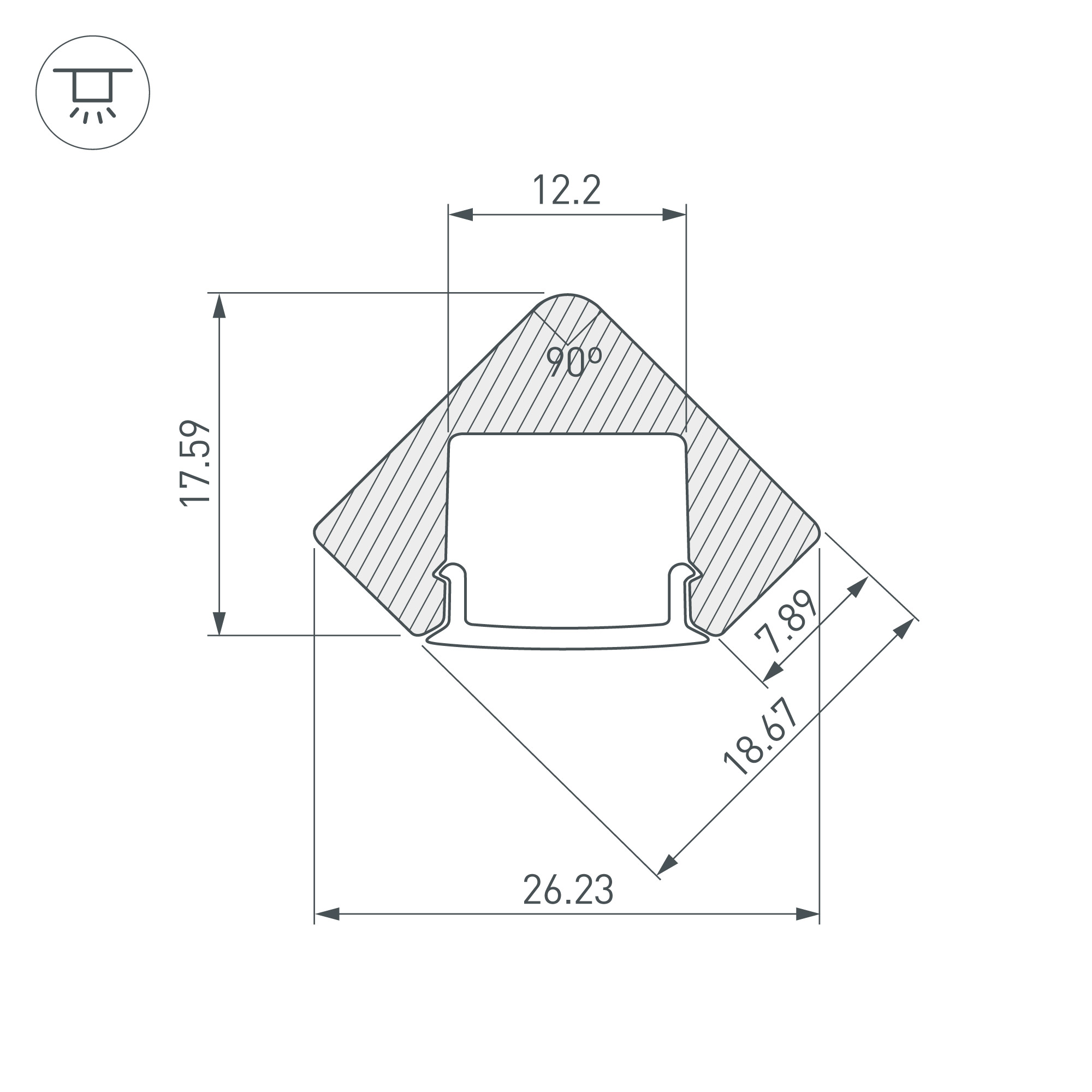 Поставка под заказ от 1 компл. Комплект с экраном. Алюминиевый анодированный угловой профиль для светодиодных лент и линеек. Габаритные размеры (L×W×H): 2000x26,23x17,59 мм. Ширина площадки для ленты 12,2 мм. Аксессуары приобретаются отдельно. Минимальный заказ 1 комплект. Цена за комплект: профиль - 2 м, экран - 2 м.