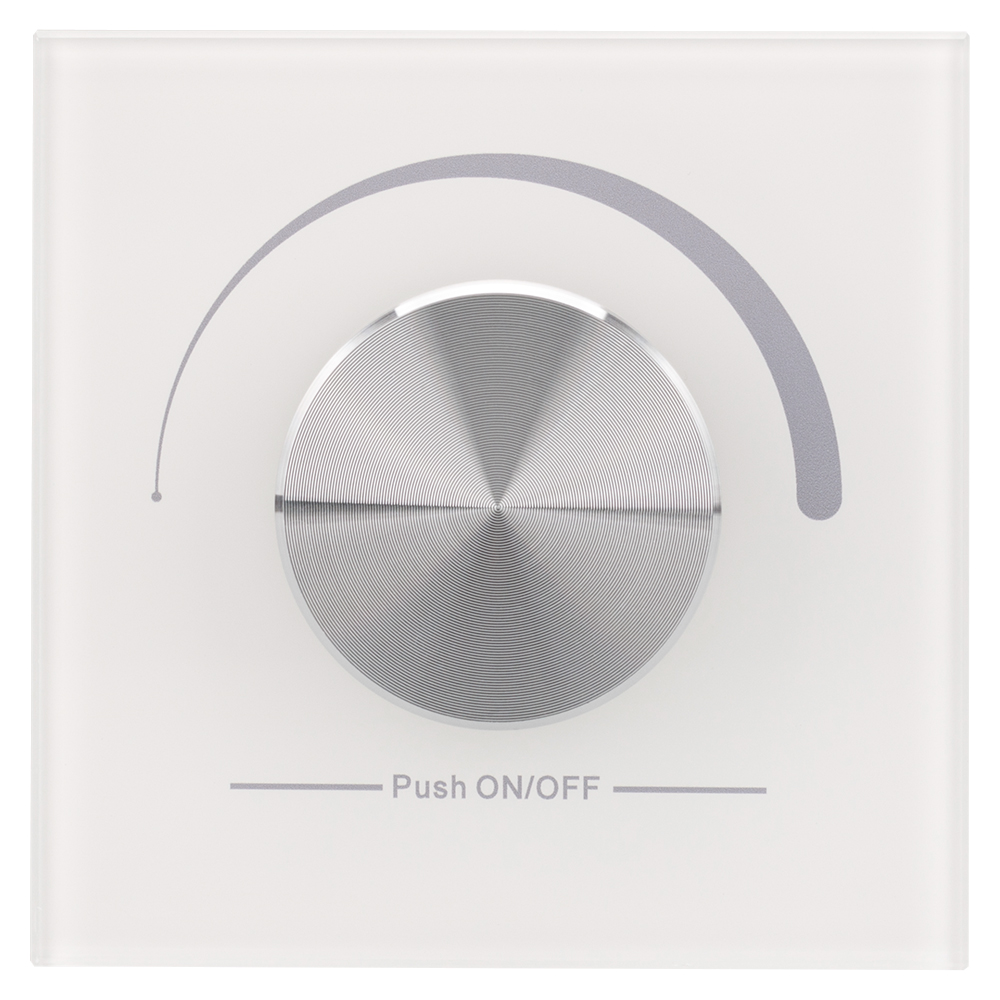 Встраиваемая роторная панель белого цвета для управления диммерами серий SR, Excellent. Позволяет осуществлять включение/выключение источников света, реуглировку их яркости. Питание панели осуществляется от 3В батарейки CR2032. Габариты составляют 86х86х45 мм, корпус белого цвета, лицевая часть рамки панели - стекло.