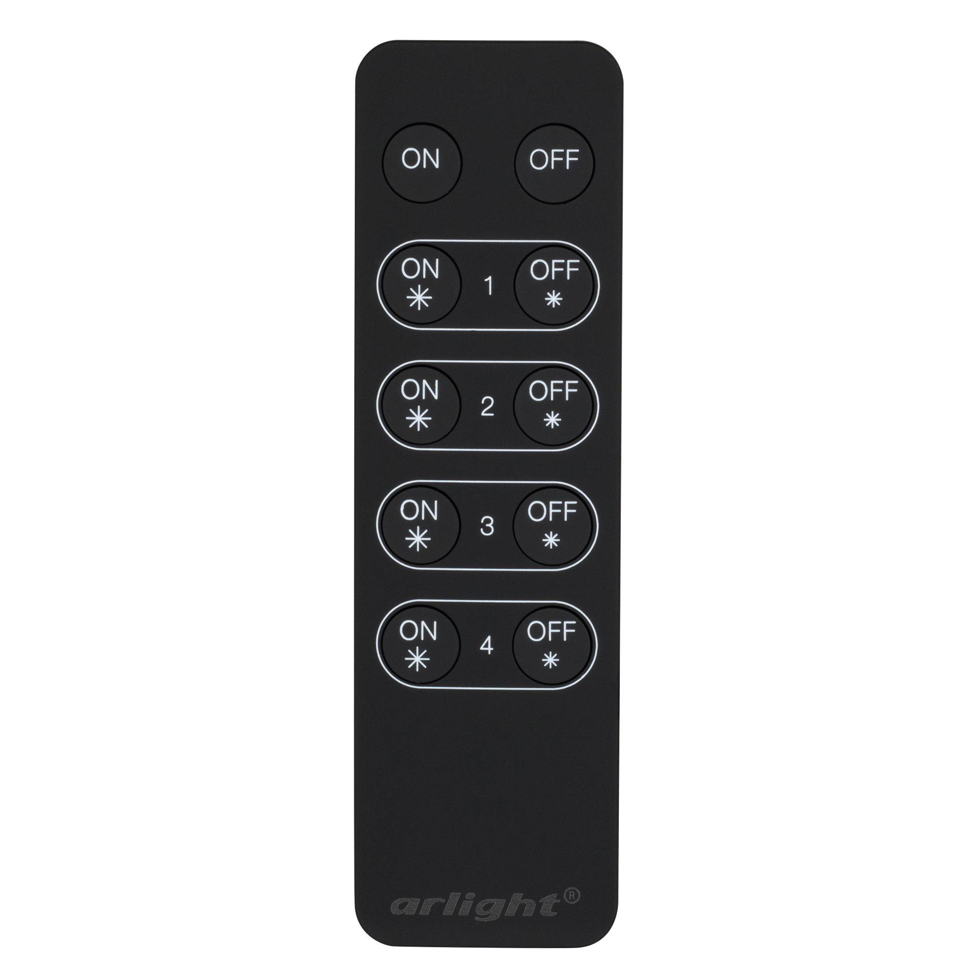 Кнопочный радиопульт черного цвета для управления диммерами серий SR, Excellent. Позволяет осуществлять включение/выключение источников света, реуглировку их яркости в 4-х различных зонах. Настенный держатель в комплекте. Питание пульта осуществляется от 3В батарейки CR2025. Габариты составляют 137x39x11мм, пластиковый корпус чёрного цвета.