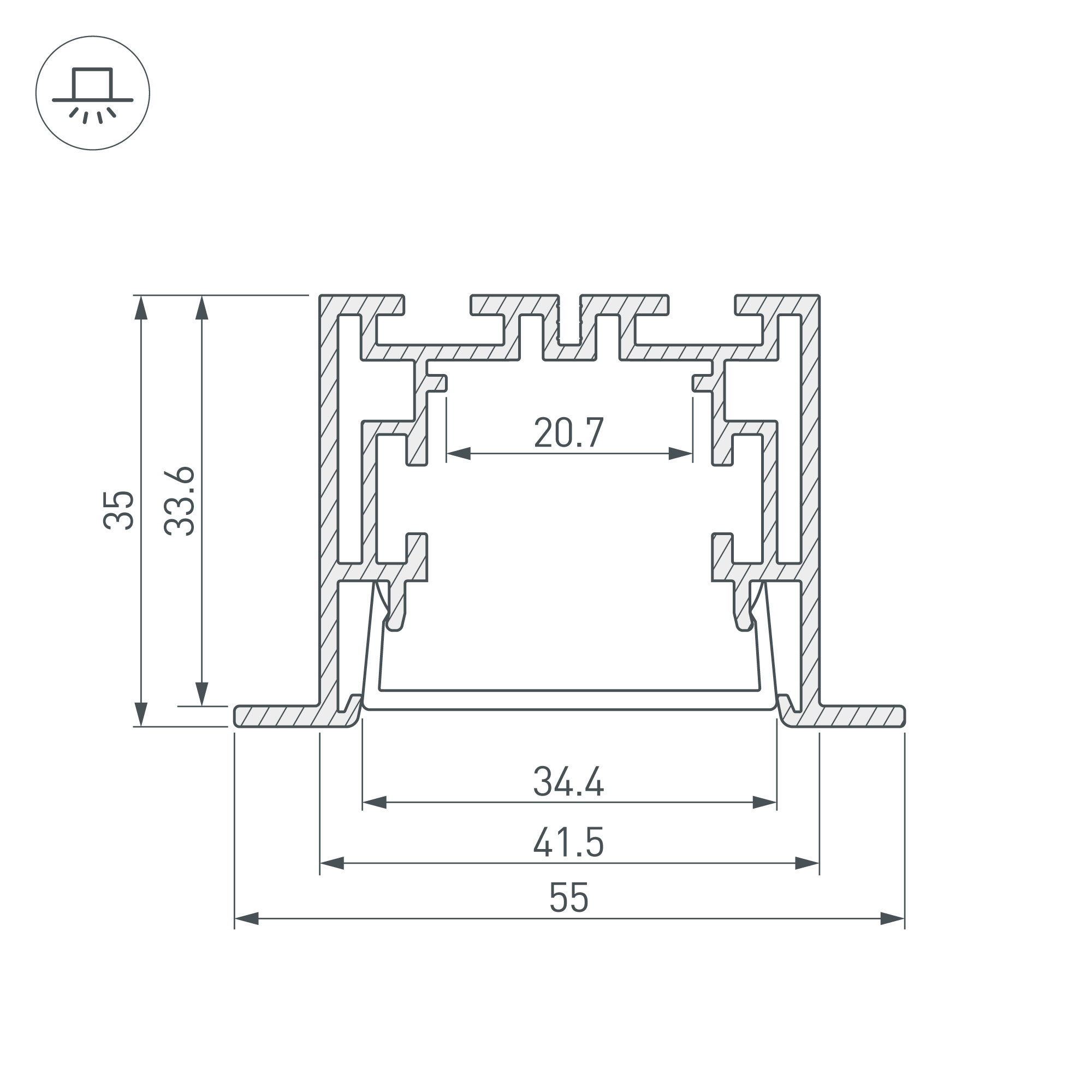 Комплект с экраном. Алюминиевый анодированный профиль для светодиодных лент и линеек. Габаритные размеры (L×W×H): 2500x55x35 мм. Рекомендуемый паз для установки: ширина 45 мм, глубина 70мм (±1 мм). В комплекте профиль, PC матовый экран. Ширина площадки для ленты 20,7 мм. Светопропускание экрана 85%. Аксессуары приобретаются отдельно. Цена за комплект: профиль - 2,5 м, экран - 2,5 м.