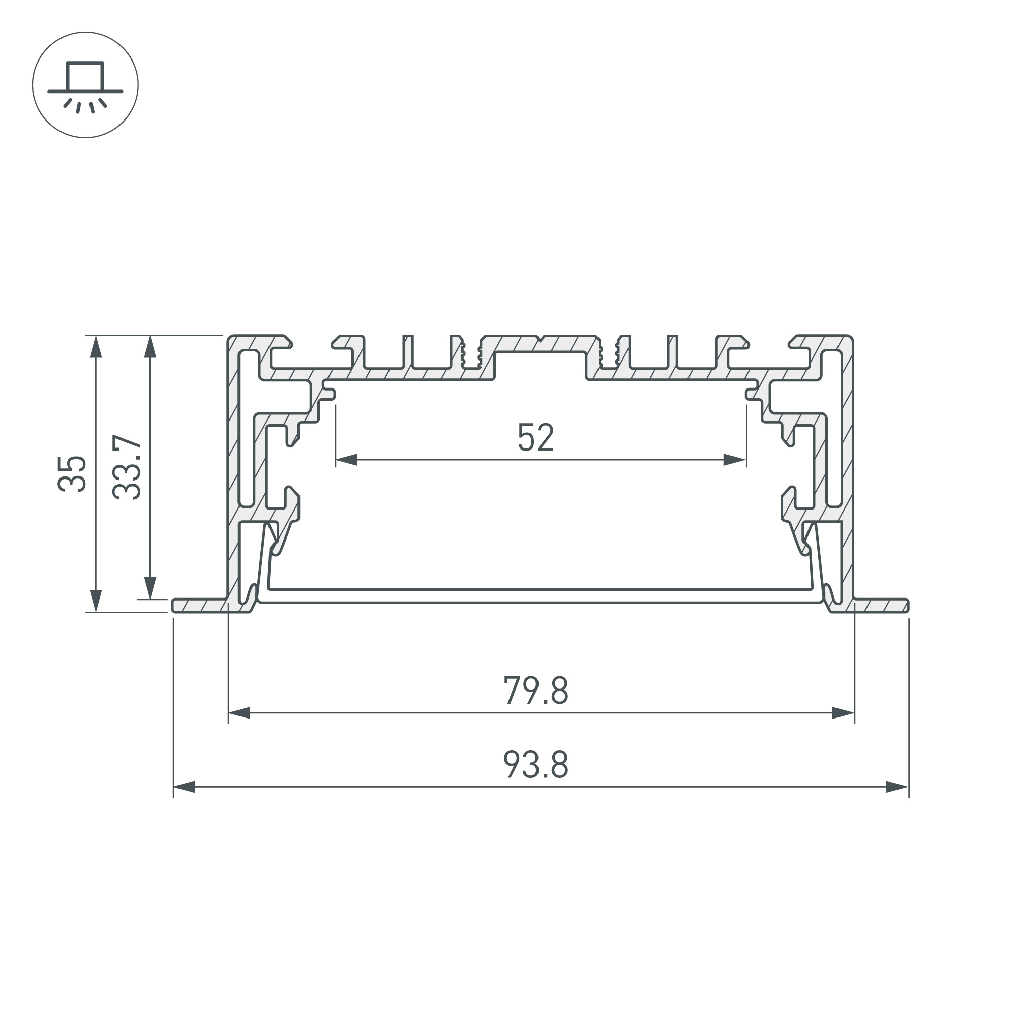 Габаритные размеры профиля составляют 2500 мм в длину, 94 мм в ширину и 35 мм в высоту. Площадка для установки светодиодных лент позволяет использовать ленту шириной до 52 мм и мощностью до 64 Вт/м. Это обеспечивает гибкость в выборе светодиодных лент и создает потрясающие световые решения.