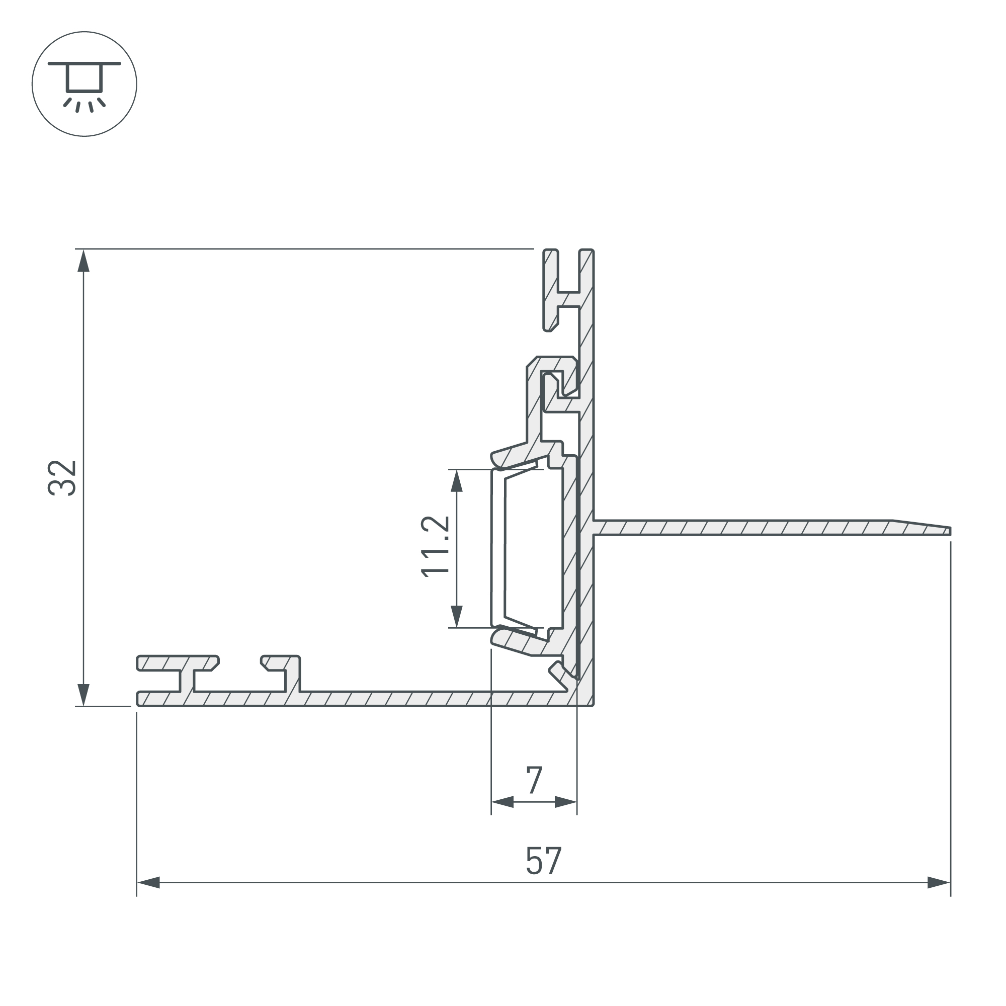 Двухкомпонентный накладной алюминиевый профиль с возможностью выбора направления свечения (параллельно или перпендикулярно плоскости потолка) для подсветки ниш и других элементов интерьера. "Тонкий край" под финишную отделку. Габаритные размеры профиля составляют 2000 мм в длину, 57 мм в ширину и 32 мм в высоту. Площадка для установки светодиодных лент позволяет использовать ленту шириной до 11 мм и мощностью до 53,2 Вт/м. Это обеспечивает гибкость в выборе светодиодных лент и создает потрясающие световые решения.