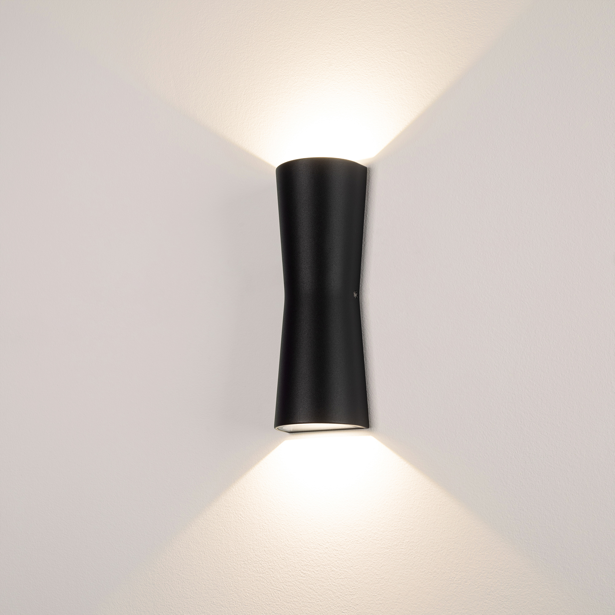 Светодиодный светильник для наружной подсветки стен, свет вверх-вниз. Цвет ТЕПЛЫЙ БЕЛЫЙ 3000К, 855Лм, светодиоды 2x6Вт Cree 1304, угол 97°. Влагозащищенный корпус IP54 - черный алюминий, экран закалённое стекло. Питание 230В, мощность 12 Вт. Размеры ДхШхВ -260х90х60 мм.