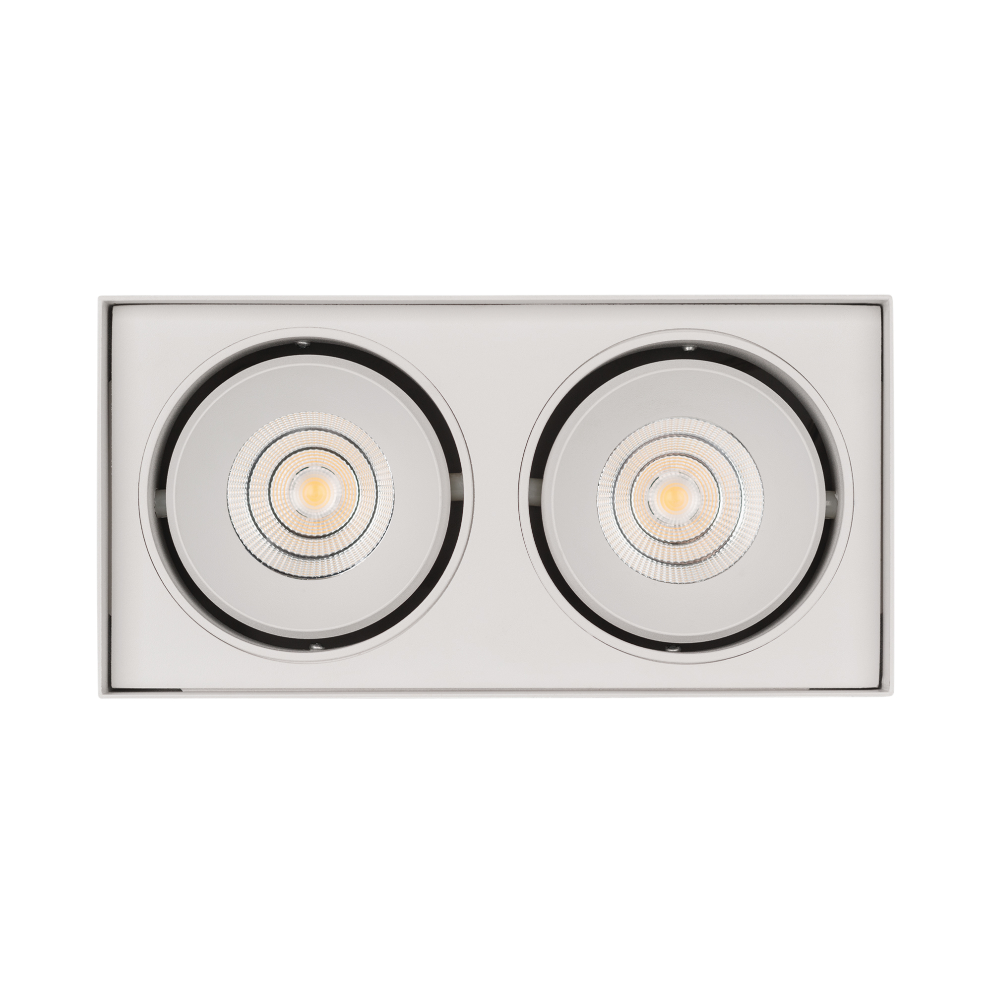 Накладной интерьерный светильник. Мощность 2x11 Вт, св. поток 1660 лм, 75 лм/Вт, теплый 3000 K, CRI>90, угол 40°, регулируемое направление луча 30°, напряжение питания 230 В. Белый квадратный корпус из алюминия, степень защиты IP20. Размер: длина 100 мм, ширина 200 мм, высота 135 мм. Монтаж накладной. Драйвер 18-24 В, 500 мА (2 штуки), пульсация <5%.