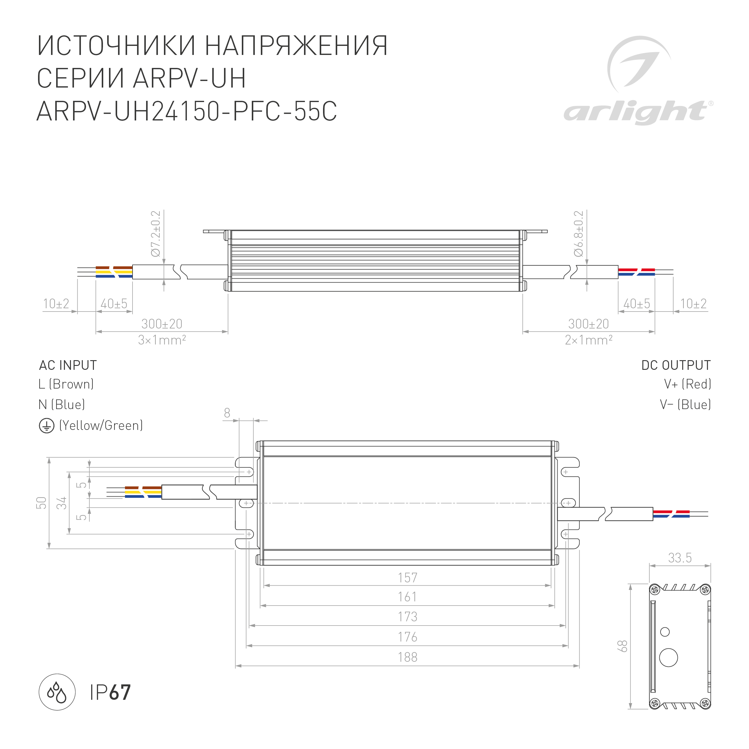 Источник напряжения с гальванической развязкой для светодиодных изделий. Предназначен для работы в условиях Крайнего Севера с запуском до -55С. Входное напряжение 120-240 VAC. Выходные параметры: 24 В, 6.3 А, 150 Вт. Встроенный PFC >0.95. Герметичный алюминиевый корпус IP 67. Рабочая температура -55…+60C⁰. Габаритные размеры длина 188 мм, ширина 67.5 мм, высота 33.5 мм. Гарантийный срок 5 лет.