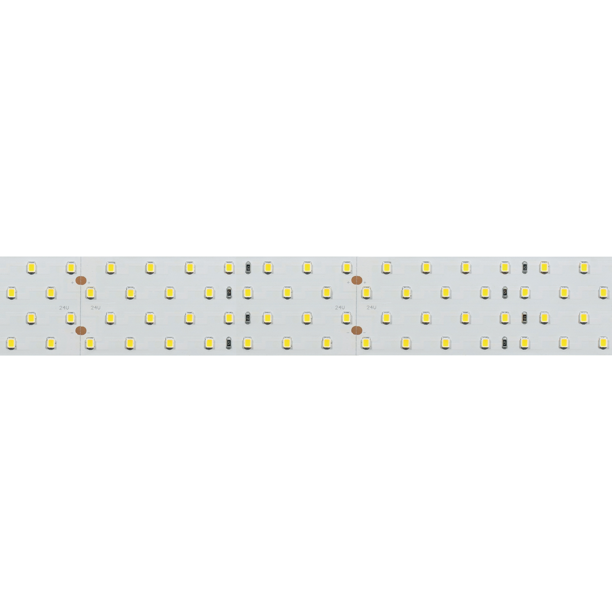 Широкая четырехрядная лента LUX шириной 36 мм с очень высоким индексом цветопередачи CRI>98 и высокой световой эффективностью. Светодиоды SMD 2835 (280 шт/м) с дневным белым цветом свечения (3800–4200 К). Мощность 30 Вт/м, напряжение питания 24 В. Минимальный отрезок 100 мм (28 светодиодов). Встроенные широкие линии света для основного освещения. Создание накладных и подвесных широких светильников из алюминиевого профиля с равномерным свечением по всей длине.