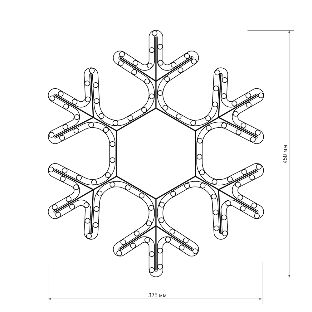 Светодиодная фигура СНЕЖИНКА. Размер 450x375 мм. Цвет светодиодов ТЕПЛЫЙ БЕЛЫЙ (3000 К), постоянное свечение. 108 светодиодов. Напряжение питания 230 В, потребляемая мощность 6.5 Вт, степень пылевлагозащиты IP65. Фигура укомплектована проводом питания для подключения к сети 230 В (без вилки питания).