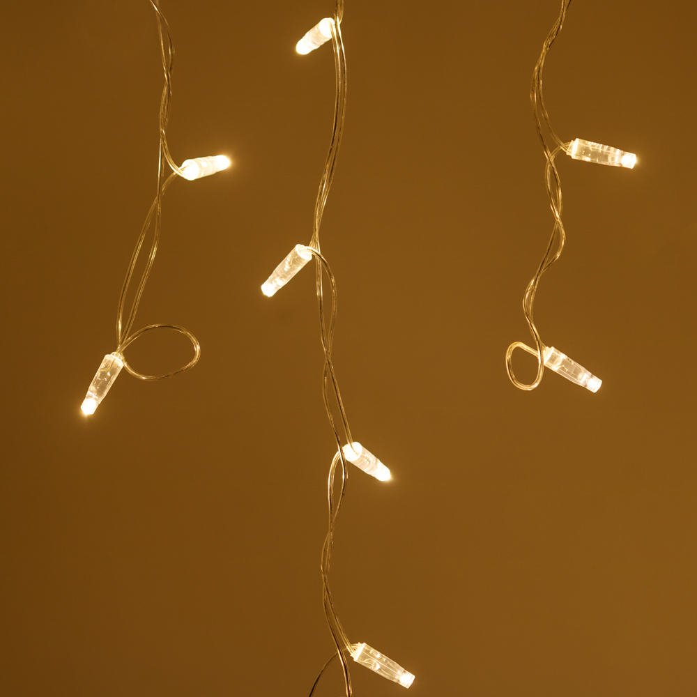 Светодиодная бахрома Classic. Размер 2400x600 мм (длина 2400 мм, по длине 24 нити высотой 200/600 мм). Количество светодиодов 88 шт размером 7 мм. Цвет свечения ТЕПЛЫЙ БЕЛЫЙ (3000 К), эффект постоянного свечения с резким световым рисунком (прозрачная вогнутая линза). Провод прозрачный, ПВХ. Питание 230 В, Мощность 6 Вт, защита IP65, применение на улице под навесом. Аксессуары для подключения приобретаются отдельно.