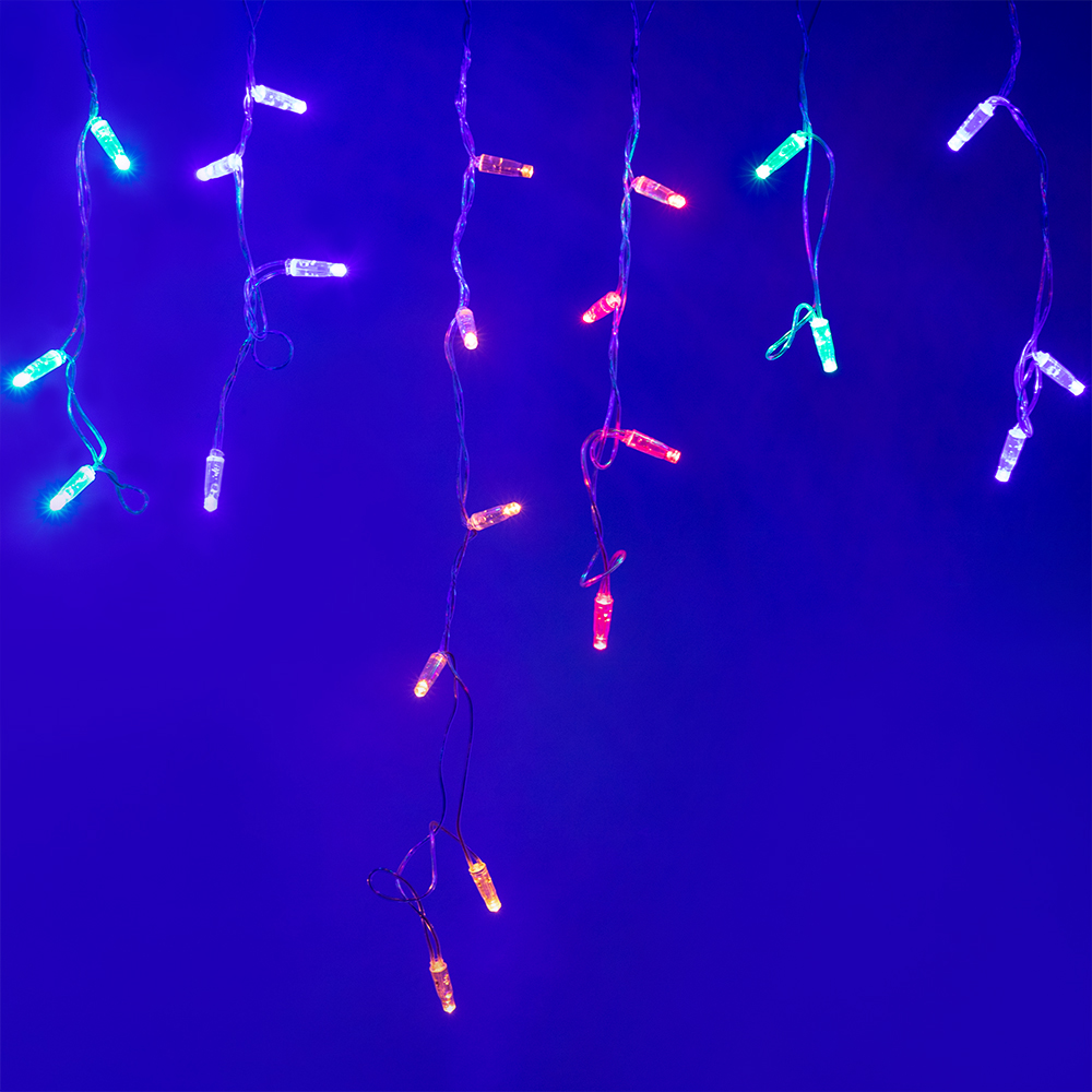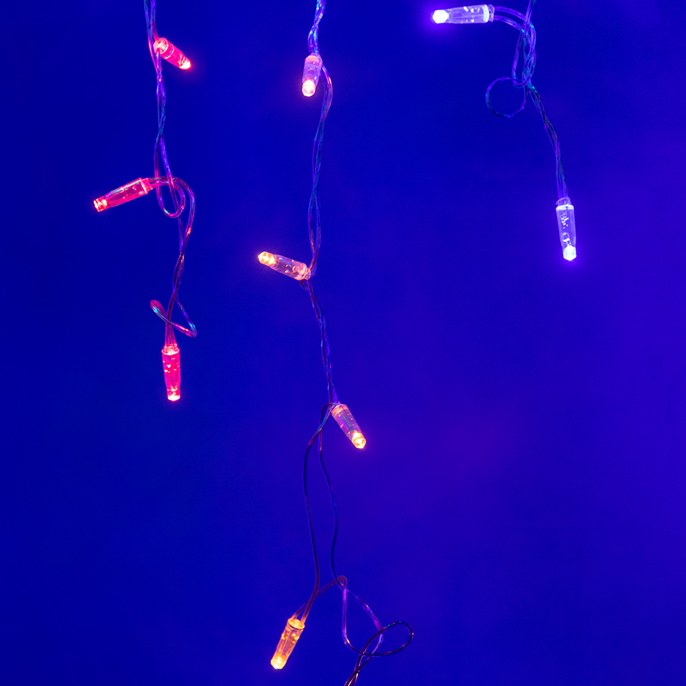 Светодиодная бахрома Classic. Размер 2400 мм (длина 2400 мм, по длине 24 нити высотой 200 / 600 мм). Цвет свечения RGB (цвет светодиодов чередуется), динамические и статические эффекты свечения свечения с резким световым рисунком (прозрачная вогнутая линза). Провод прозрачный, ПВХ. Питание 230 В, Мощность 6 Вт, защита IP65, применение на улице под навесом. Аксессуары для подключения приобретаются отдельно.