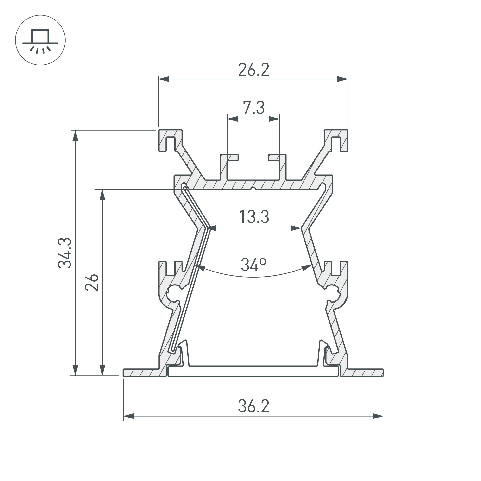 Габаритные размеры профиля составляют 2000 мм в длину, 36,2 мм в ширину и 34,3 мм в высоту. Площадка для установки светодиодных лент позволяет использовать ленту шириной до 13 мм и мощностью до 34 Вт/м. Это обеспечивает гибкость в выборе светодиодных лент и создает потрясающие световые решения.