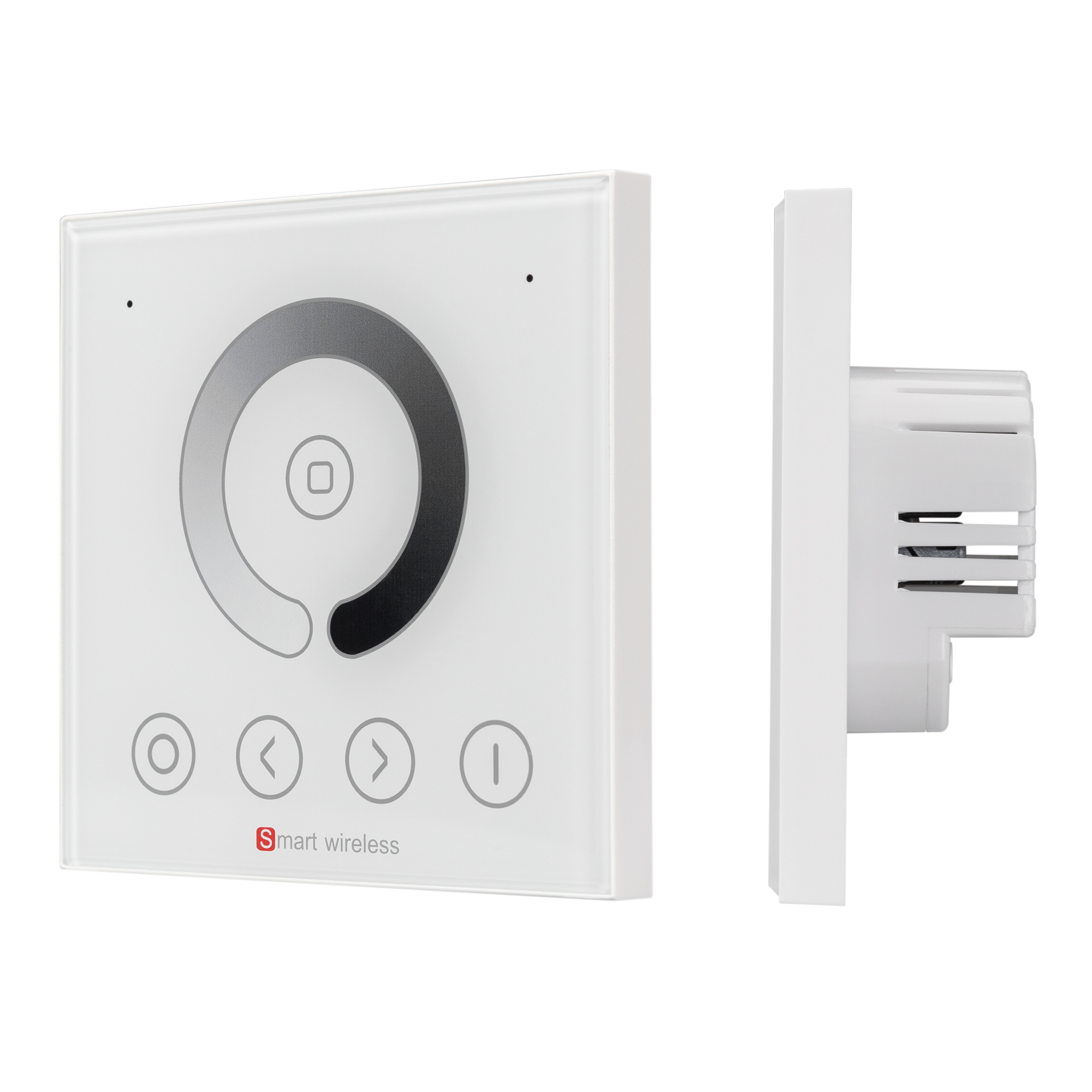 Настенная сенсорная панель со стекляным покрытием предназначена для встройки в стандартный подрозетник. С помощью панели возможно управление одноцветной светодиодной лентой - включение/выключение, регулировка яркости. Панель имеет сенсорный круг для точного и легкого изменения яркости ленты, кнопки переключения между 4-мя параллельными каналами, а также кнопки включения и выключения света. Изделие выполнено в белом цвете из высококачественного стекла, устойчивого к появлению мелких царапин и сколов. Питание панели имеет диапазон напряжений от 12В до 24В, максимальный ток 4А на 1 канал, максимальная мощность 192-384Вт (в зависимости от напряжения питания). Габариты панели составляют 86х86х33мм.