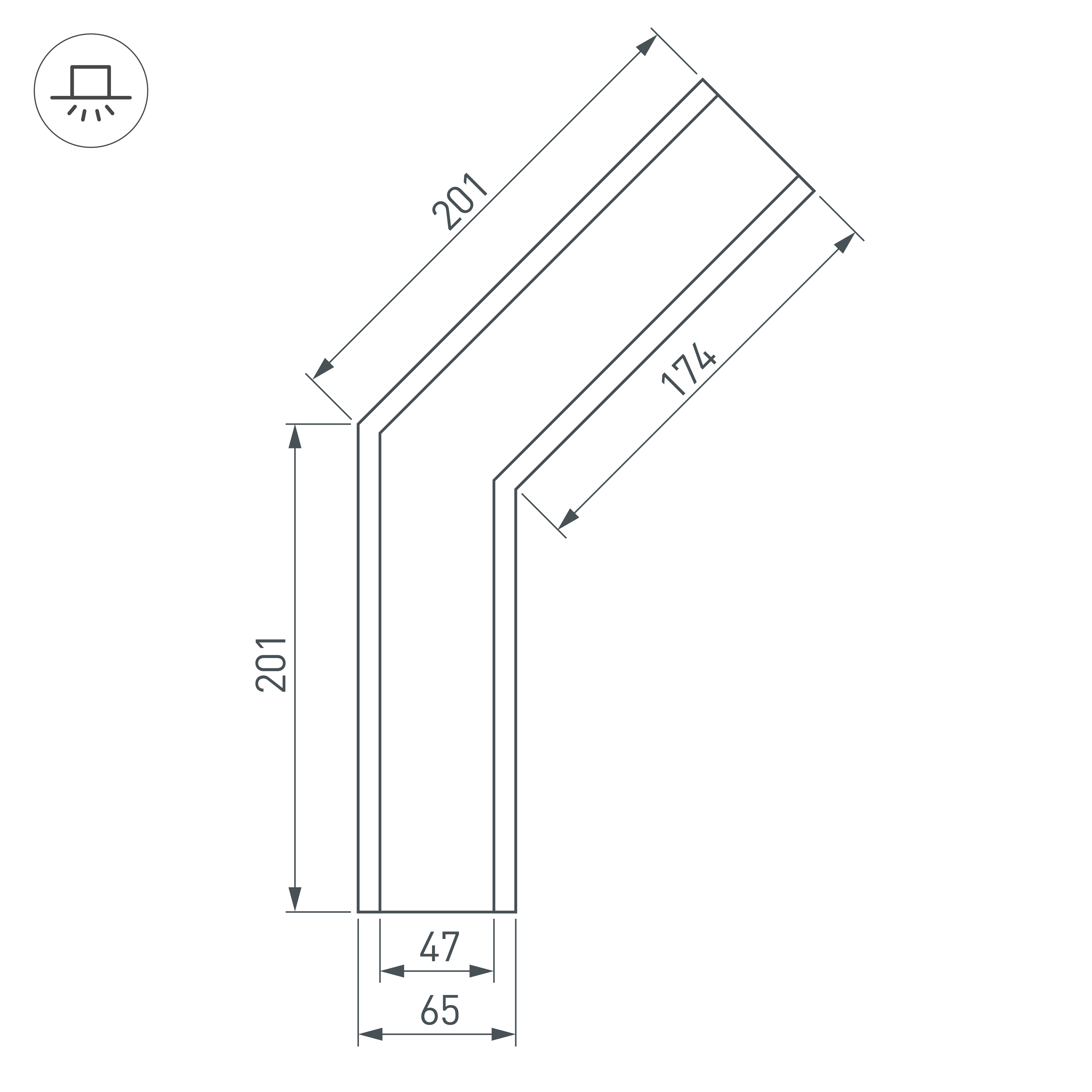 Угол в сборе с накладным фланцем для соединения двух профилей SL-LINIA65-F под углом 135° в одной плоскости в комплекте с матовым экраном и соединителями. Экран образует линию на плоскости. Применятся при изготовлении светильников сложной геометрии. Длина внешней стороны угла 201мм. Цена за комплект.