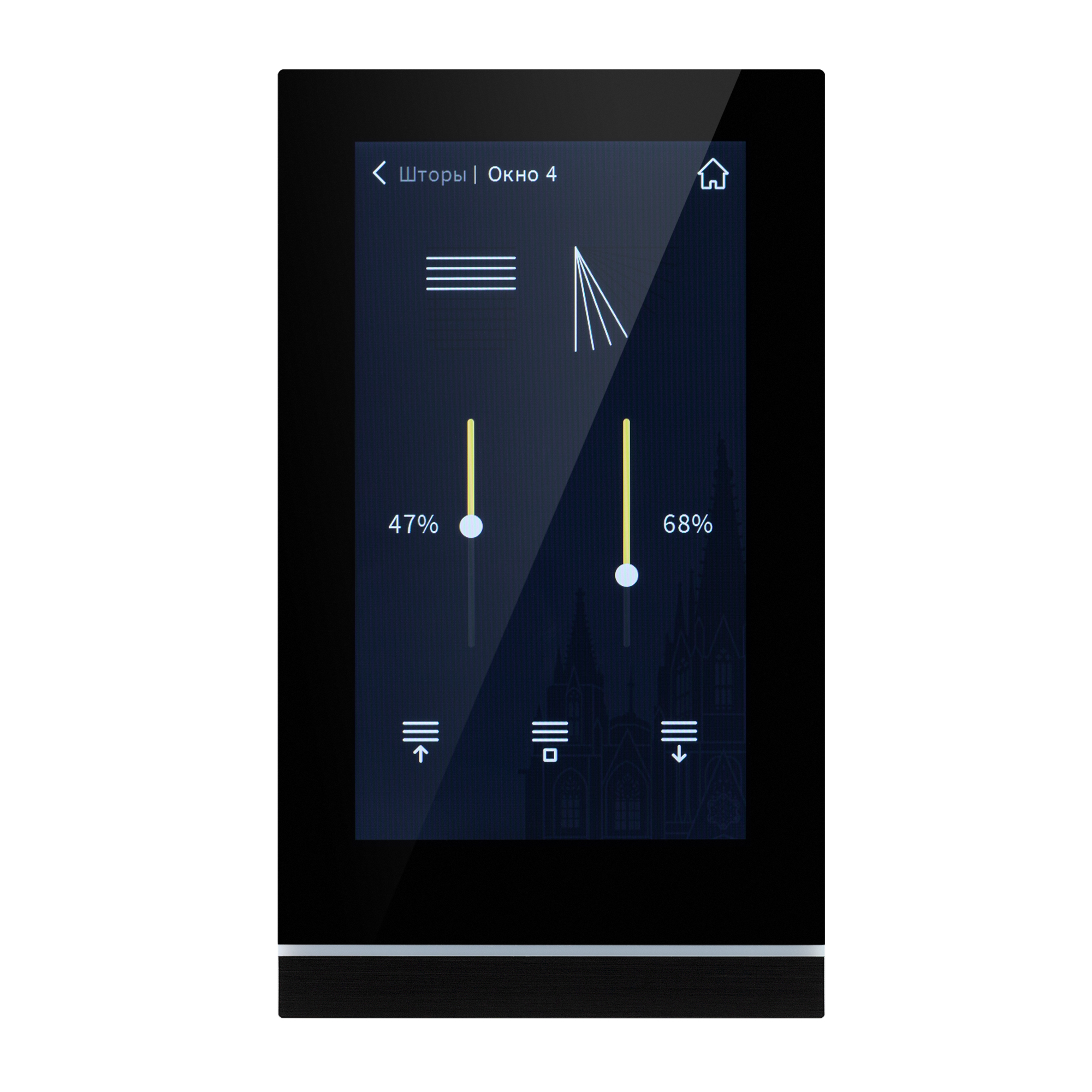 Многофункциональная страиваемая панель чёрного цвета с сенсорным управлением, предназначенная для включения и выключения световых сцен в системах управления светом KNX. Позволяет осуществлять включение/выключение, диммирование, управление шторами и жалюзи, управлять сценами. До 16 слайдов, на каждом до 8 элементов управления. Виджеты для RGBW, MIX (CCT), климатики, мультимедиа. Встроенный датчик температуры. Логические функции. Устройство совместимо с исполнительными устройствами стандарта KNX, в том числе, мировых производителей ABB, SCHNEIDER ELECTRIC, SIEMENS, ZENNIO и другими. Удобное и точное управление при помощи при помощи цветного 5.1" сенсорного IPS дисплея с разрешением 480х854. Напряжение питания 24-30В. Габариты устройства составляют 149x86x32 мм, установка в стандартную монтажную коробку. Пластиковый корпус, лицевая часть - стекло, цвет чёрный.