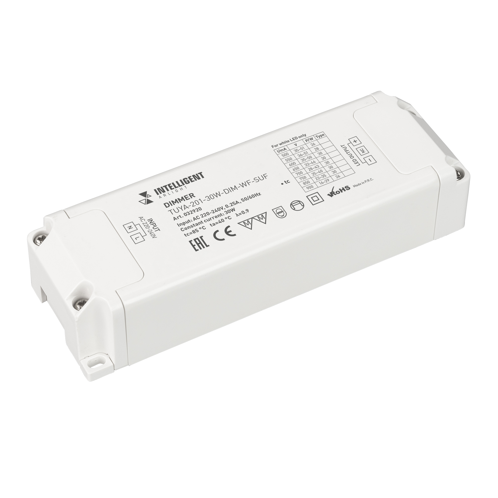 Диммер одноканальный, для светодиодных светильников. Выбор значения выходного тока осуществляется подстроечным резистором на плате. Вход 220-240V AC, PF>0.95 выход 500-900mA@24-50V DC (в зависимости от вых. тока), мощность 30W. Низкий пусковой ток <5А@100mks. Защита от КЗ на выходе, перегрузки, перегрева. Управление через WI-FI 2.4ГГц.Управляется панелями серии TY-228-х-RF, совместим с платформой TUYA, и АЛИСА от ЯНДЕКС. Управление со смартфона через приложение INTELLIGENT ARLIGHT.
