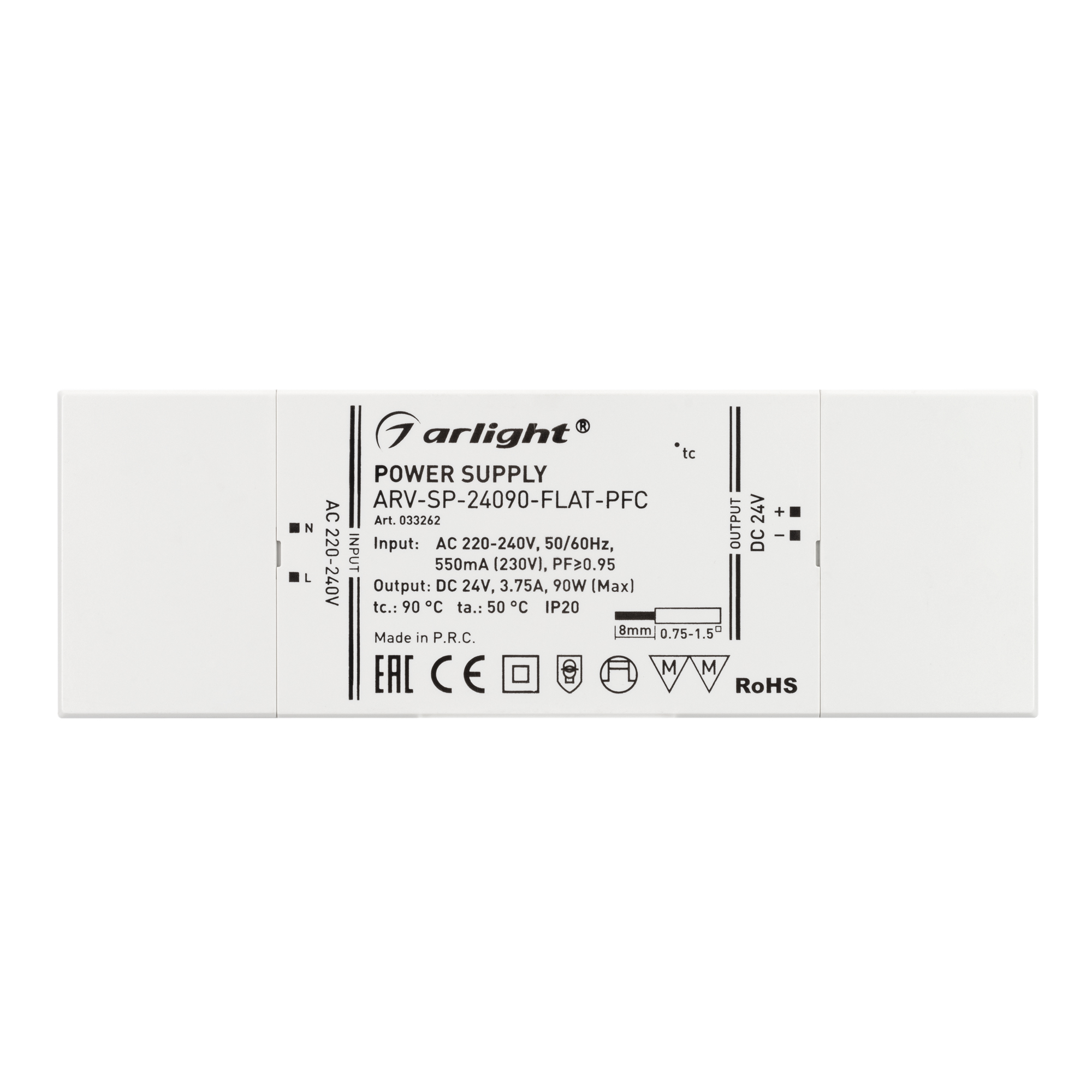 Поставка под заказ от 500 шт. Источник напряжения с гальванической развязкой для светодиодных изделий. Входное напряжение 220-240 VAC. Выходные параметры: 24 В, 3.75 А, 90 Вт. Встроенный PFC >0.95. Сверхтонкий пластиковый корпус IP20. Габаритные размеры длина 190 мм, ширина 65 мм, высота 22 мм. Гарантийный срок 5 лет.