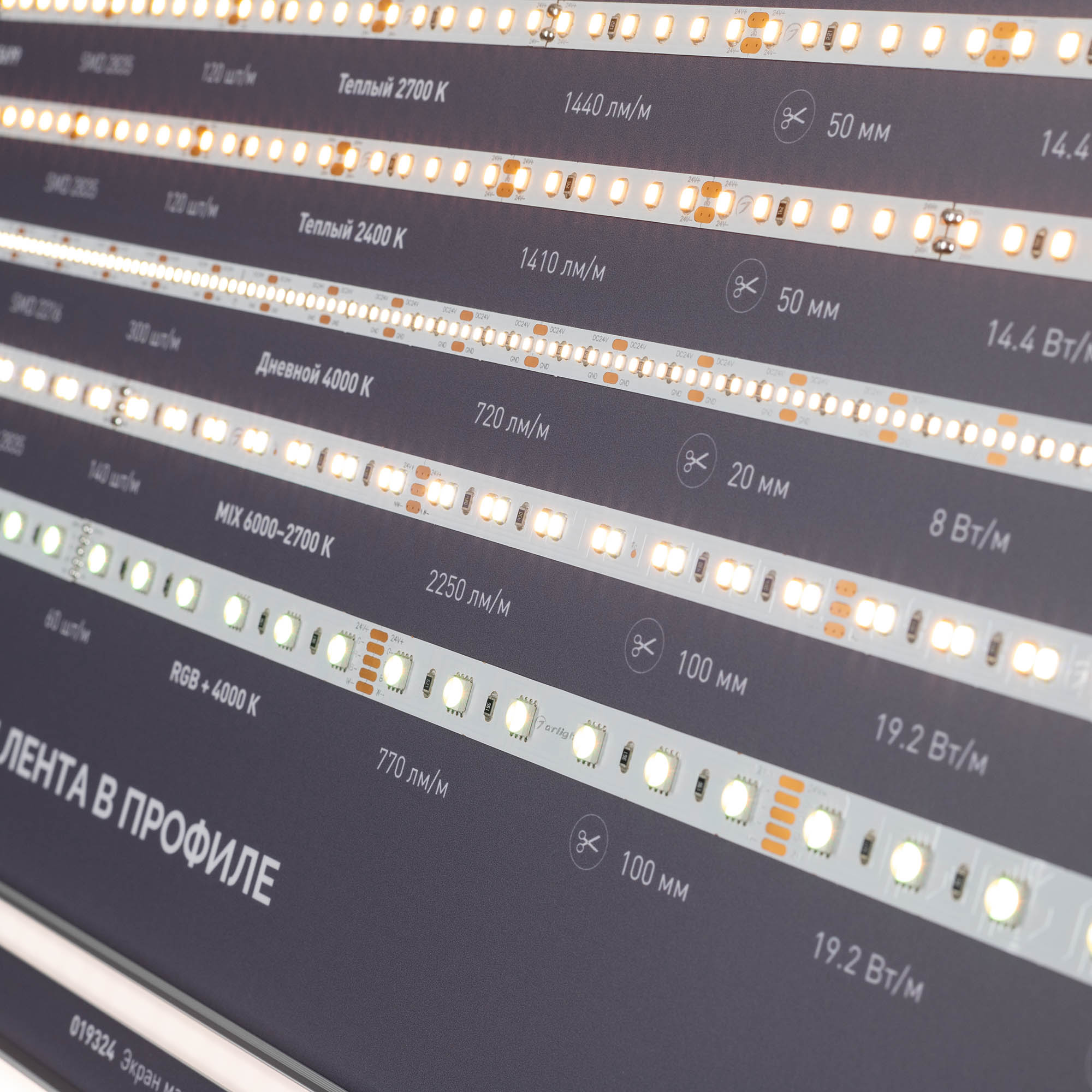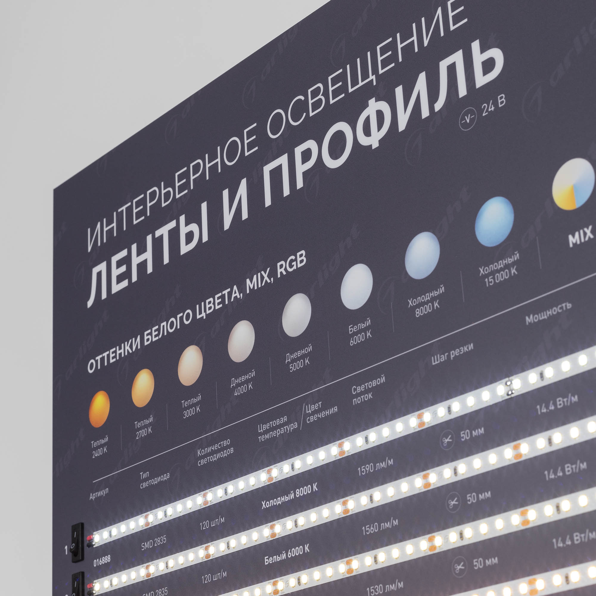 Обзорный мини-стенд по ассортименту светодиодных лент и их применению совместно с накладным профилем для декоративного и основного освещения.