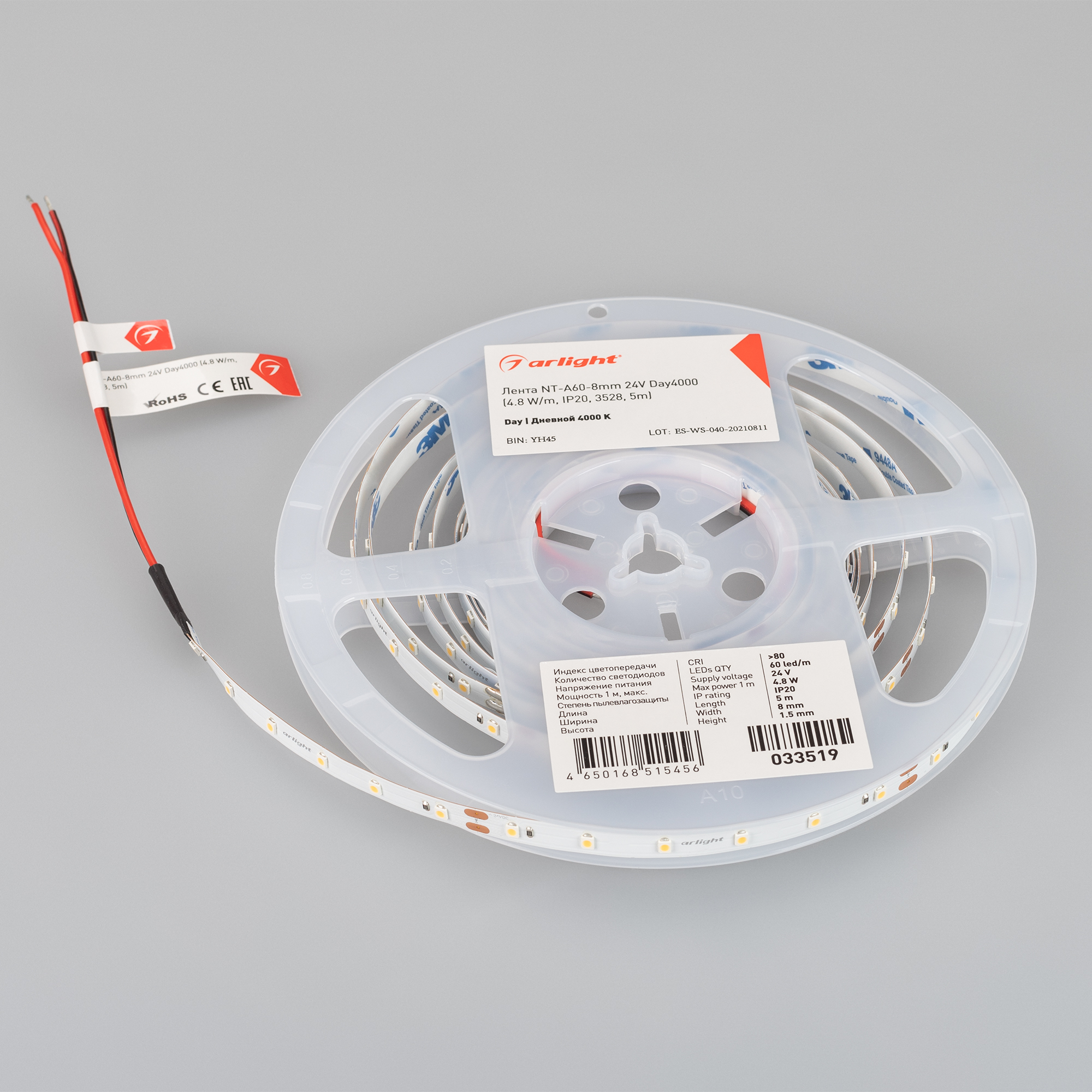 Светодиодная лента NT серии A60 шириной 8 мм, со светодиодами SMD 3528, 60 шт/м, белого цвета свечения (6000K), индекс цветопередачи CRI>90. Предназначена для декоративной подсветки интерьера, потолочных ниш, рабочих зон кухни, рекламных конструкций и витрин. Мощность 4.8 Вт/м, напряжение питания 24 В. Минимальный отрезок 100 мм (6 светодиодов).