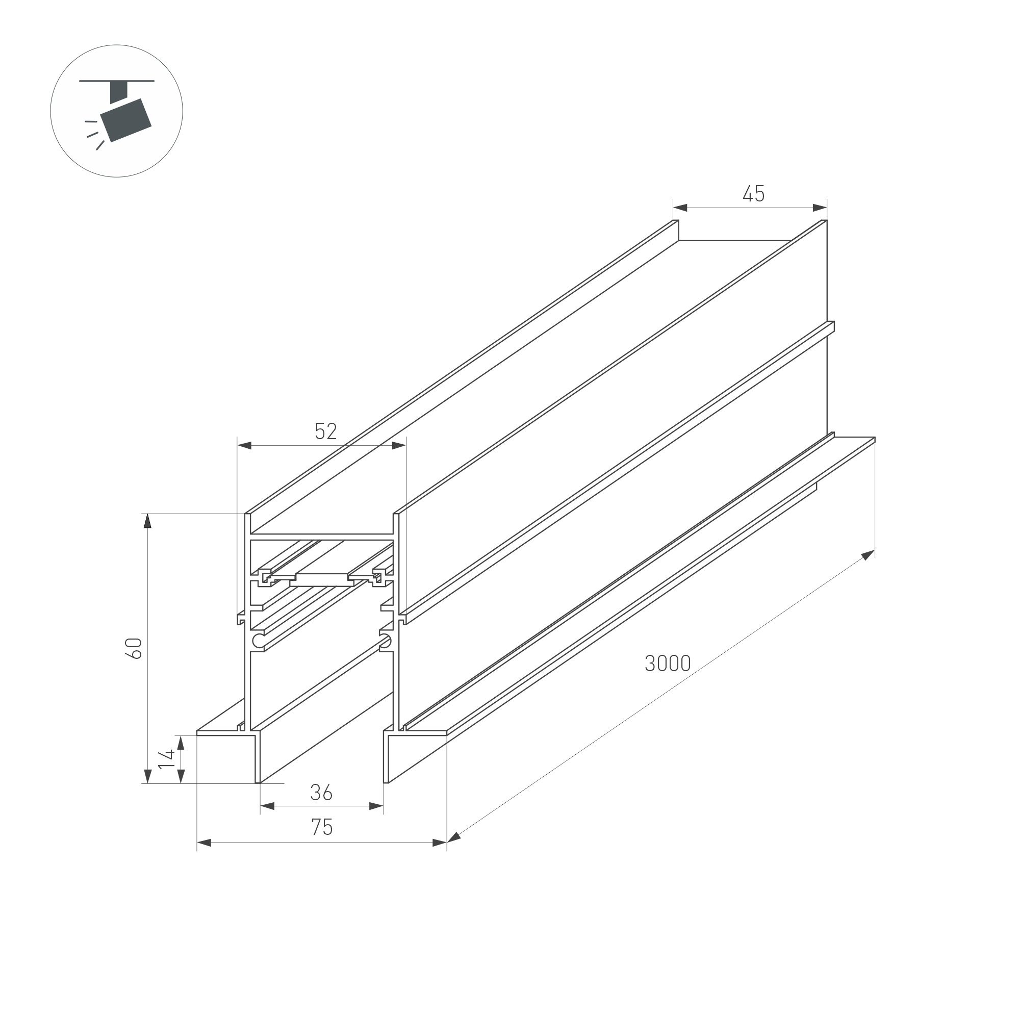 Встраиваемый магнитный трек с фланцем для монтажа в гипсокартонный потолок, длина 3000 мм. DC24V. Материал алюминий, цвет черный. Две заглушки в комплекте. Размер ДxШxВ: 3000x75x60 мм. Размер (с учетом заглушек и фланцев) ДxШxВ: 3040x75x60 мм. DC24V.