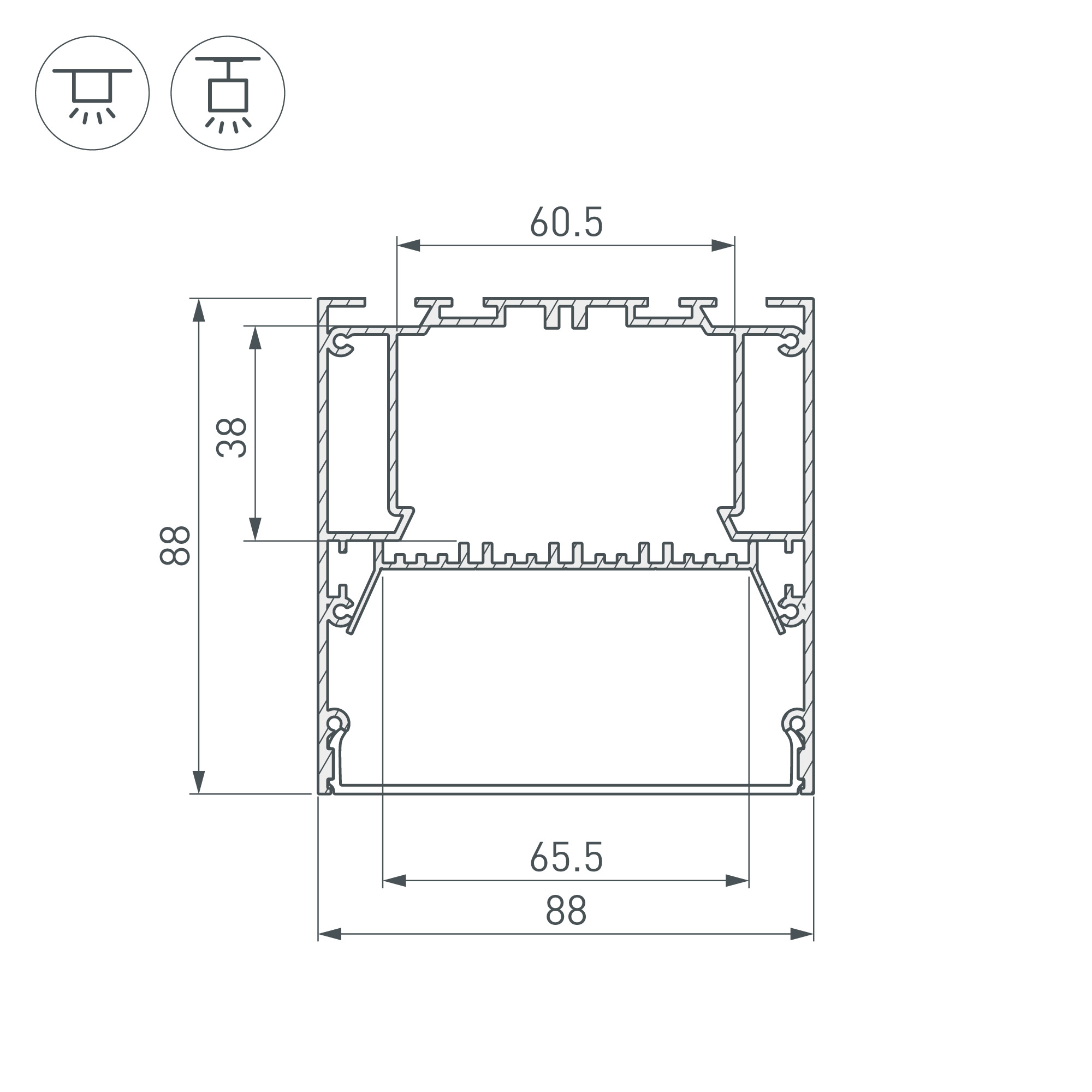 Накладной/подвесной профиль из анодированного алюминия для основного освещения и контурной подсветки. Отсек для блока питания (48х38 мм) и съемная площадка для светодиодной ленты значительно облегчают сервисное обслуживание осветительного оборудования. Габаритные размеры профиля составляют 2000 мм в длину, 88 мм в ширину и 88 мм в высоту. Площадка для установки светодиодных лент позволяет использовать ленту шириной до 65,5 мм и мощностью до 47 Вт/м. Это обеспечивает гибкость в выборе светодиодных лент и создает потрясающие световые решения. Экран, заглушки и другие аксессуары (в том числе фиксаторы для соединения профиля с площадкой для ленты) не включены в комплект и приобретаются отдельно. Цена указана за 1 метр профиля. Отличное решение для создания современных световых проектов.
