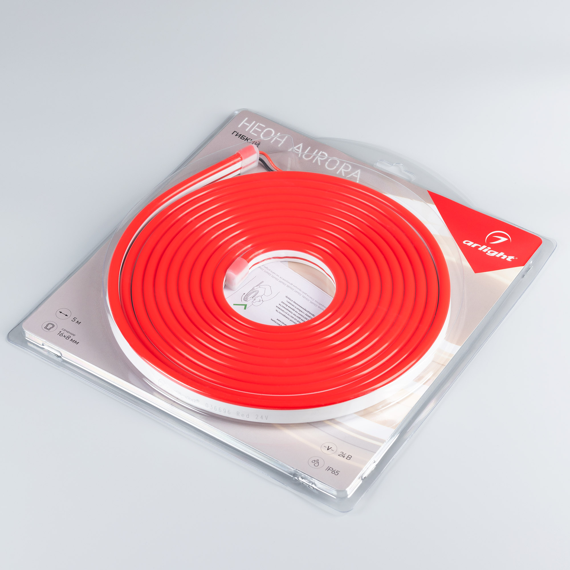 Гибкий неон AURORA в силиконовой оболочке. Светодиоды SMD2835, 120 шт-м, цвет КРАСНЫЙ. Сечение 16х8 мм, горизонтальный (боковой) изгиб, IP65, шаг резки 8.33 мм, мощность 10 Вт-м, напряжение питания DC 24V. Укомплектован заглушками и 30см проводом питания.