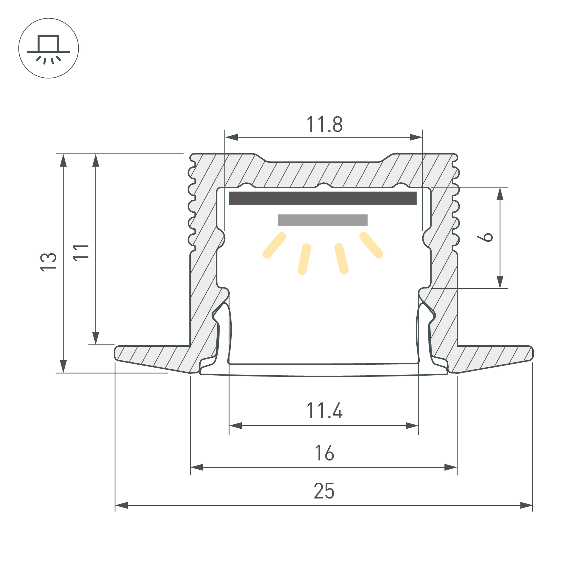 Встраиваемый профиль с накладным фланцем черного цвета из алюминия для контурной подсветки интерьера. Габаритные размеры профиля составляют 2000 мм в длину, 25 мм в ширину и 13 мм в высоту. Площадка для установки светодиодных лент позволяет использовать ленту шириной до 12 мм и мощностью до 15,2 Вт/м. Это обеспечивает гибкость в выборе светодиодных лент и создает потрясающие световые решения.