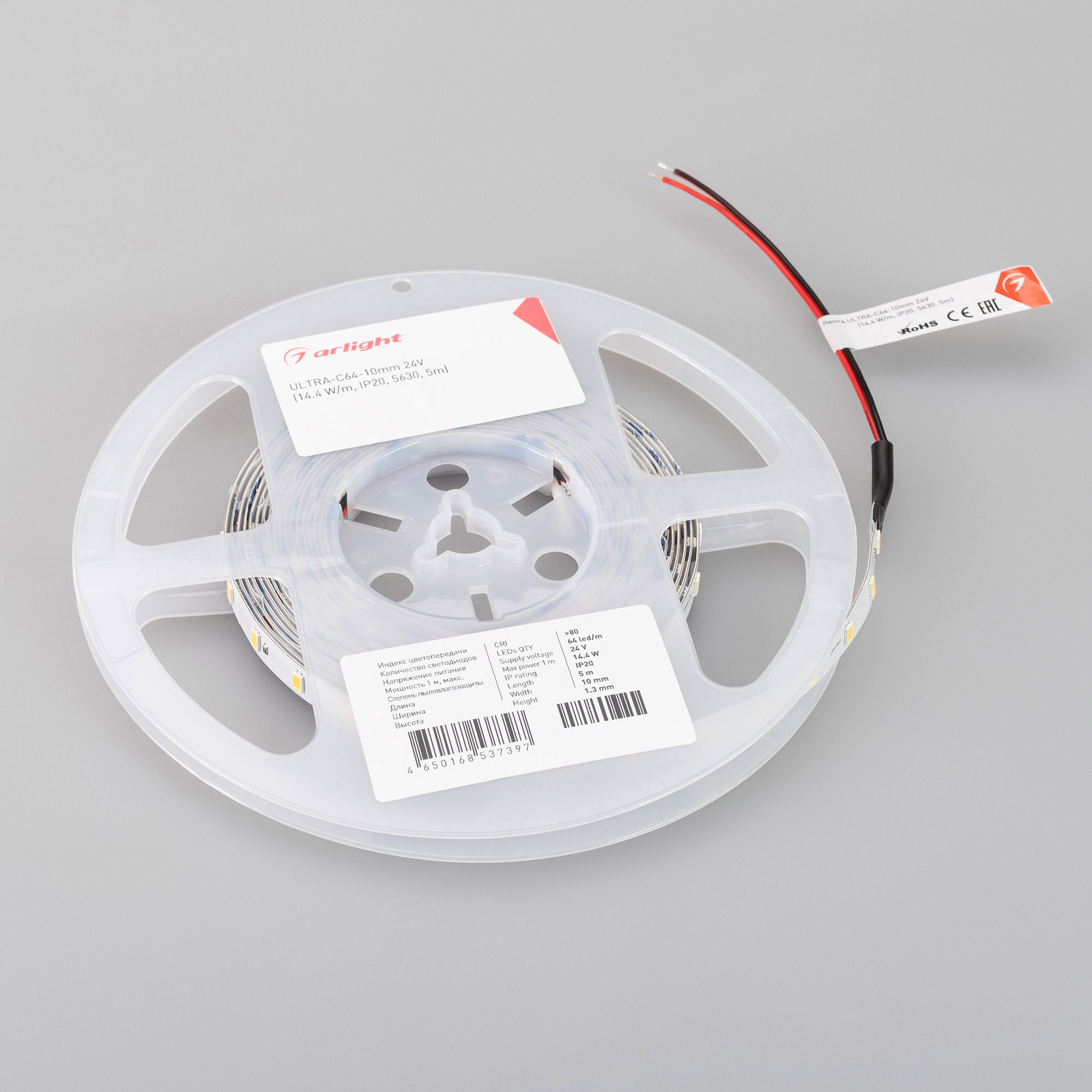 Светодиодная лента ULTRA серии C64 с высокой световой эффективностью 160 лм/Вт, шириной 10 мм, мощностью 14.4 Вт/м, белого цвета свечения (6000K). Напряжение питания 24 В. Светодиоды SMD 5630, 64 шт/м. Индекс цветопередачи CRI>80. Предназначена для применения в основном освещении жилых и офисных помещений, создания светильников на основе алюминиевого профиля, подсветка рекламных конструкций и витрин, декоративная подсветка потолков, ниш, колонн. Минимальный отрезок 125 мм (8 светодиодов). Обязательна установка на алюминиевый профиль.