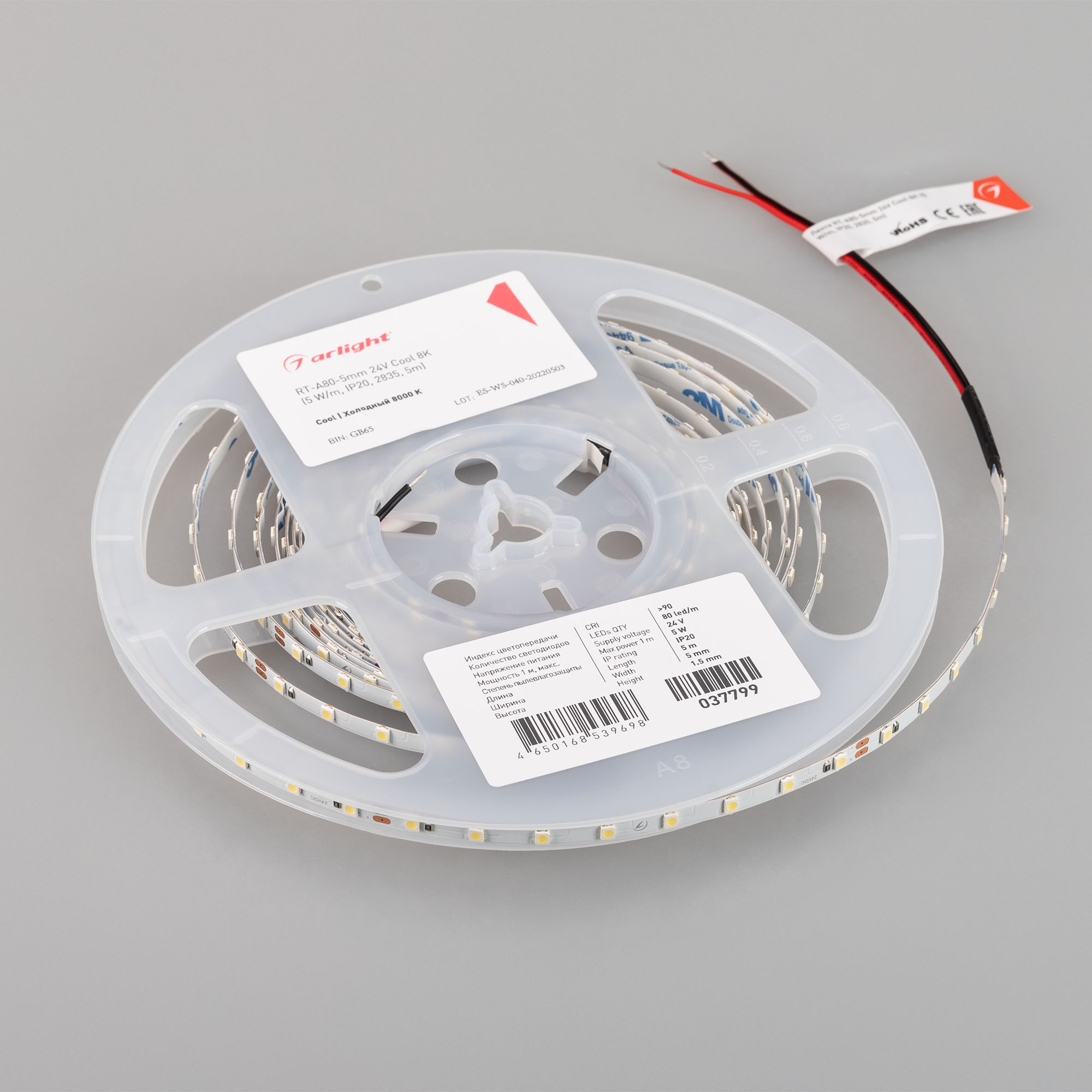 Светодиодная лента RT-A80-5mm 24V Cool 8K (5 W/m, IP20, 2835, 5m) (Arlight, Открытый)