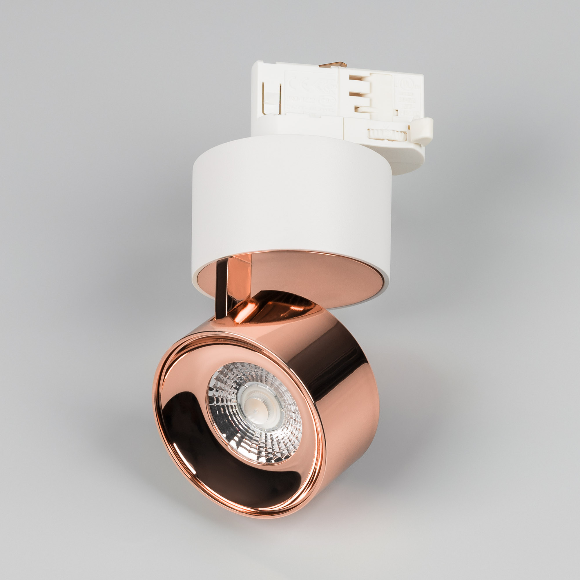 Светильник для треков/шин 4 провода. Мощность 9 Вт, св. поток 580 лм, 64 лм/Вт, дневной 4000 K, CRI>90, угол 36°, напряжение питания 230 В. Модуль цвета медь, белый круглый корпус из алюминия, степень защиты IP20. Размеры корпуса: длина адаптера 86 мм, ширина 32 мм, высота 38,2 мм., высота основания 46 мм. Размер светодиодного модуля: диаметр 77 мм, высота 59 мм. Монтаж на трек 3-фазный. Драйвер 38 В, 200 мА, пульсация <1%.