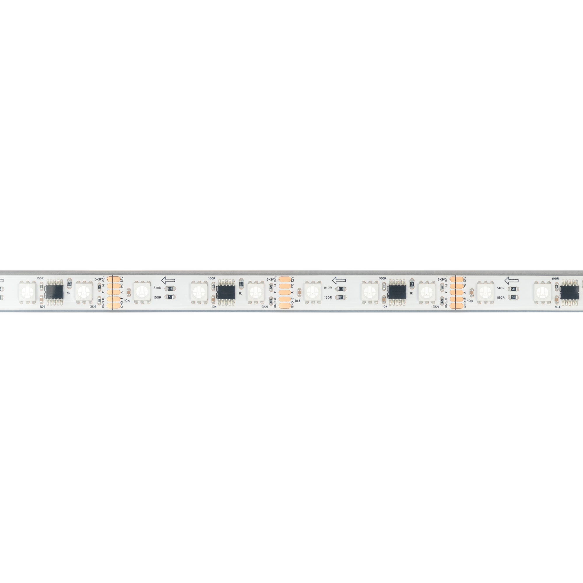 Светодиодная герметичная лента DMX серии B60 с микросхемой GS8516 (GS8526), IP68 (PFS - полная силиконовая экструзия). Светодиоды SMD 5060, 60 шт/м, 20 pixels на 1 м (100 pixels на 5 м), 1 pixel = 3 светодиода, белая плата шириной 10 мм, скотч 3М. Цвет RGB, угол 120°. Питание 12 В, мощность 14 Вт/м (70 Вт на 5 м). Размеры 5000x12x5 мм. Мин. отрезок 50 мм, 3 светодиода. Цена за 1 м.