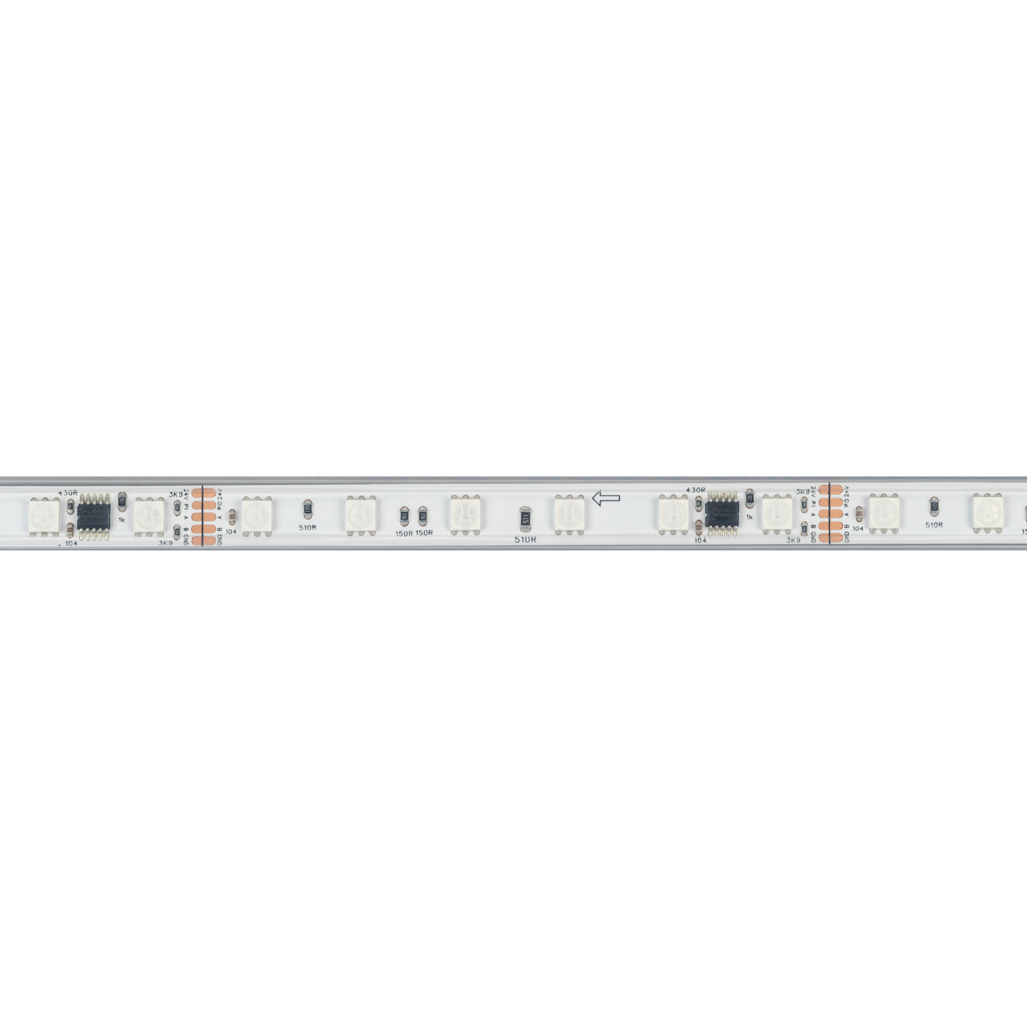 Светодиодная герметичная лента DMX серии B60 с микросхемой GS8526, IP67 (PS - силиконовая экструзия). Светодиоды SMD 5060, 60 шт/м, 10 pixels на 1 м (50 pixels на 5 м), 1 pixel = 6 светодиодов, белая плата шириной 10 мм, скотч 3М. Цвет RGB, угол 120°. Питание 24 В, мощность 14 Вт/м (70 Вт на 5 м). Размеры 5000x12x5 мм. Мин. отрезок 100 мм, 6 светодиодов. Цена за 1 м.