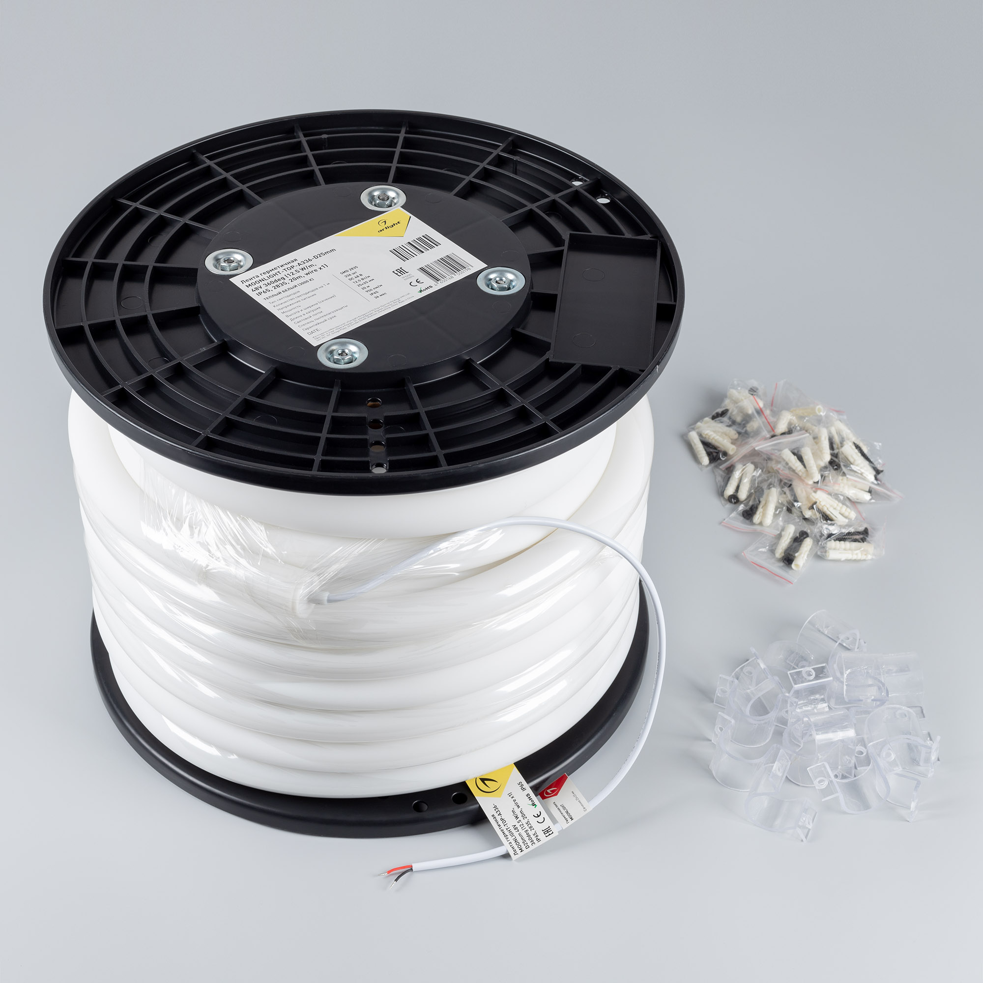 Гибкая герметичная лента MOONLIGHT имеет круглое сечение 25×25 мм и оснащена 336 светодиодами SMD2835 на метр. Дневной цвет свечения (4000К) и матовая оболочка позволяет добиться уютного освещения, а высокий индекс цветопередачи (CRI>90) позволяет создать отличную различимость цветовых оттенков. Угол излучения ленты 360°, что позволит создавать уникальные элементы декора. Лента потребляет 12,5 Вт/м и работает от 48 V. Класс пылевлагозащиты IP65 позволяет использовать ленту в т.ч. во влажных помещениях, и имеет минимальный радиус изгиба 120 мм. Габариты ленты составляют 20000×25×25 мм. Кабель питания длиной 500 мм выводится с одной стороны вдоль линии сечения ленты. Катушка содержит 20 м ленты, в комплекте идут 32 накладных пластиковых держателя. Цена указана за 1 м ленты. Гарантия на ленту 3 года. Список совместимых аксессуаров, с помощью которых можно создавать уникальные декоративные композиции, находятся в разделе "Совместимые".