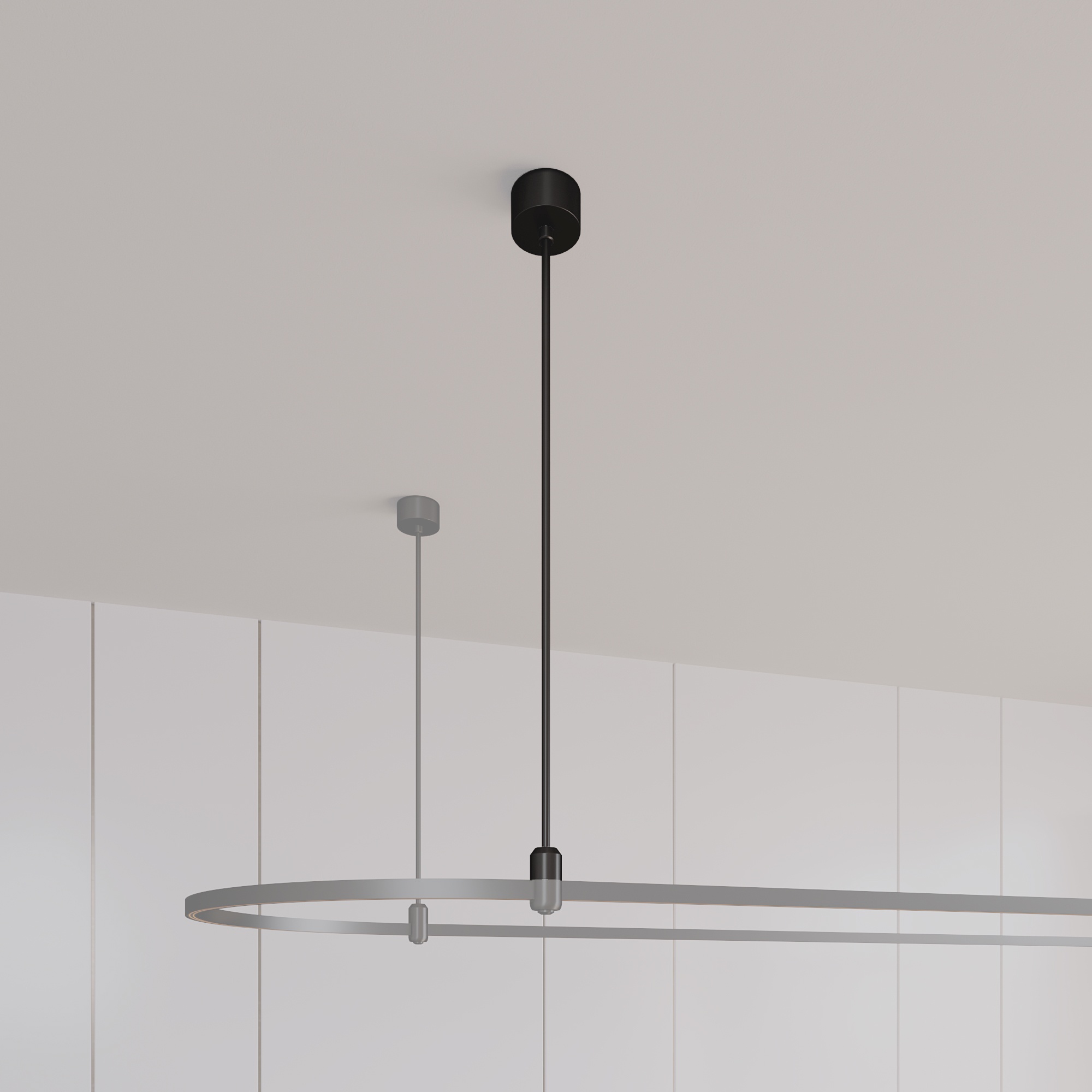 Подвес жесткий используется для крепления треков системы APRIORI к потолку или другой поверхности и подвода питания DC48V к системе. Подвес имеет тип крепления A. Изготавливается из алюминия, окрашенного в черный цвет. Диаметр чаши 80 мм, внутренний диаметр чаши 74мм, внешняя высота чаши 38 мм, глубина чаши до монтажного отверстия 25 мм, общая высота подвеса 765 мм.