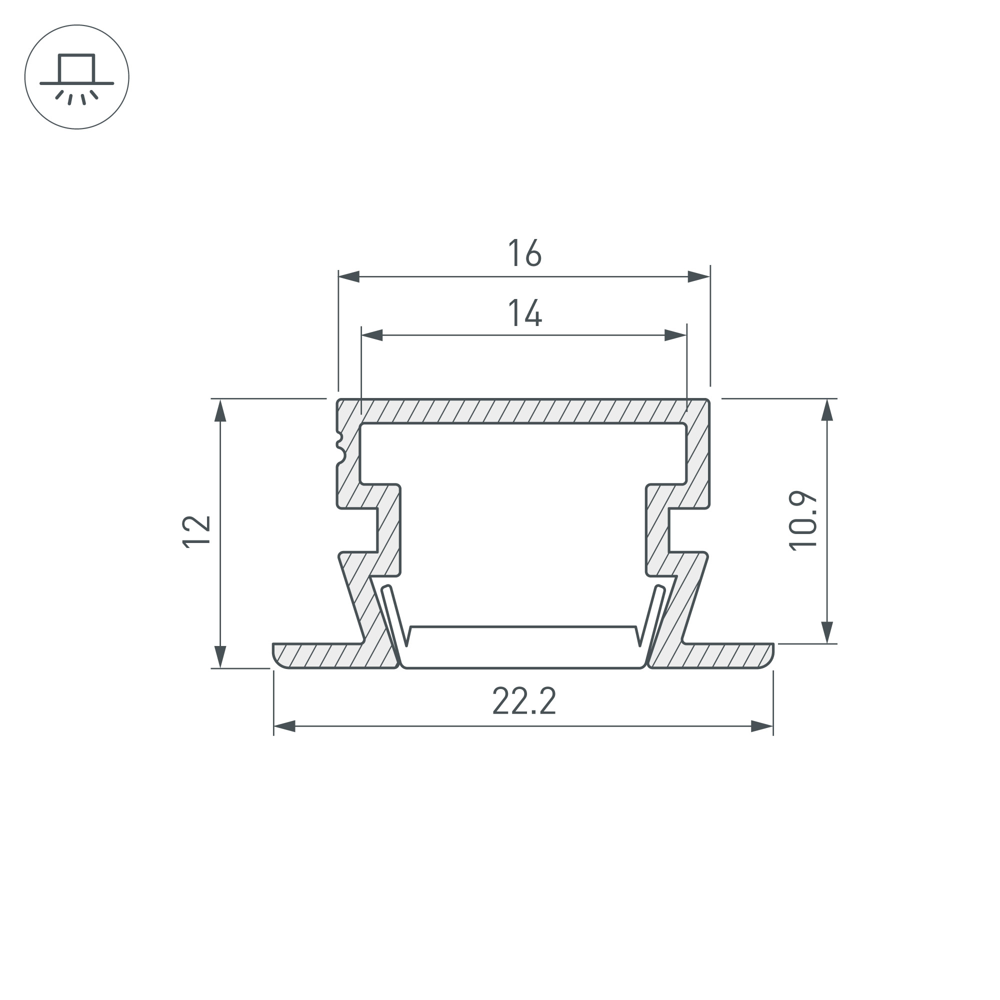 Габаритные размеры профиля составляют 2000 мм в длину, 22,2 мм в ширину и 12 мм в высоту. Площадка для установки светодиодных лент позволяет использовать ленту шириной до 14 мм и мощностью до 16,4 Вт/м. Это обеспечивает гибкость в выборе светодиодных лент и создает потрясающие световые решения.