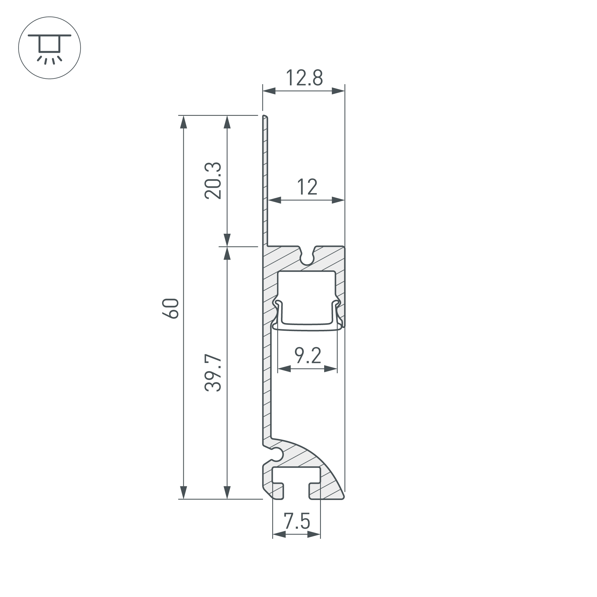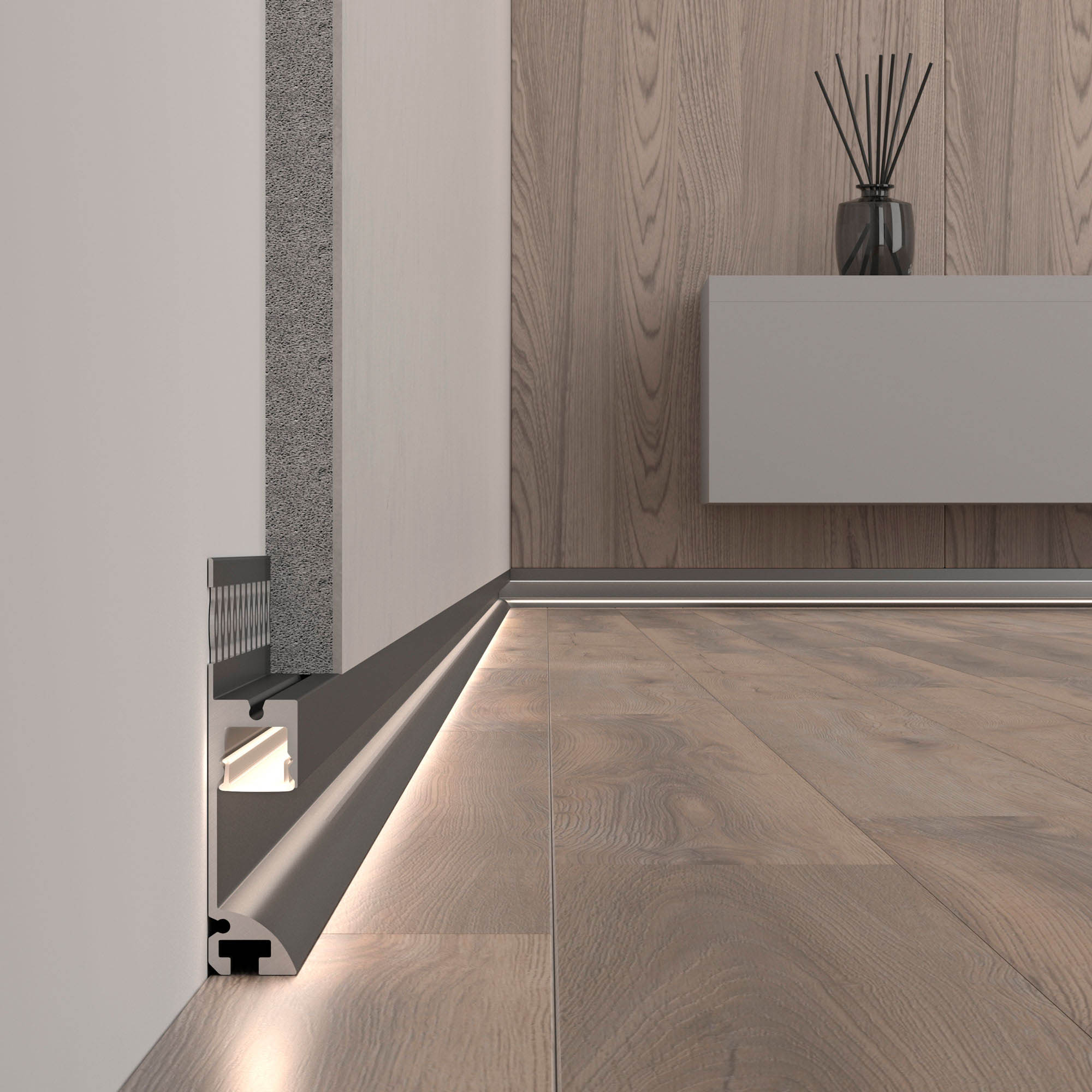 Встраиваемый алюминиевый профиль-плинтус черного цвета под строительную отделку для создания эффекта парящей стены. Габаритные размеры профиля составляют 2000 мм в длину, 12,8 мм в ширину и 60 мм в высоту. Площадка для установки светодиодных лент позволяет использовать ленту шириной до 9,2 мм и мощностью до 29 Вт/м. Это обеспечивает гибкость в выборе светодиодных лент и создает потрясающие световые решения. Экран не включен в комплект и приобретается отдельно. Цена указана за 1 метр профиля. Отличное решение для создания современных световых проектов.