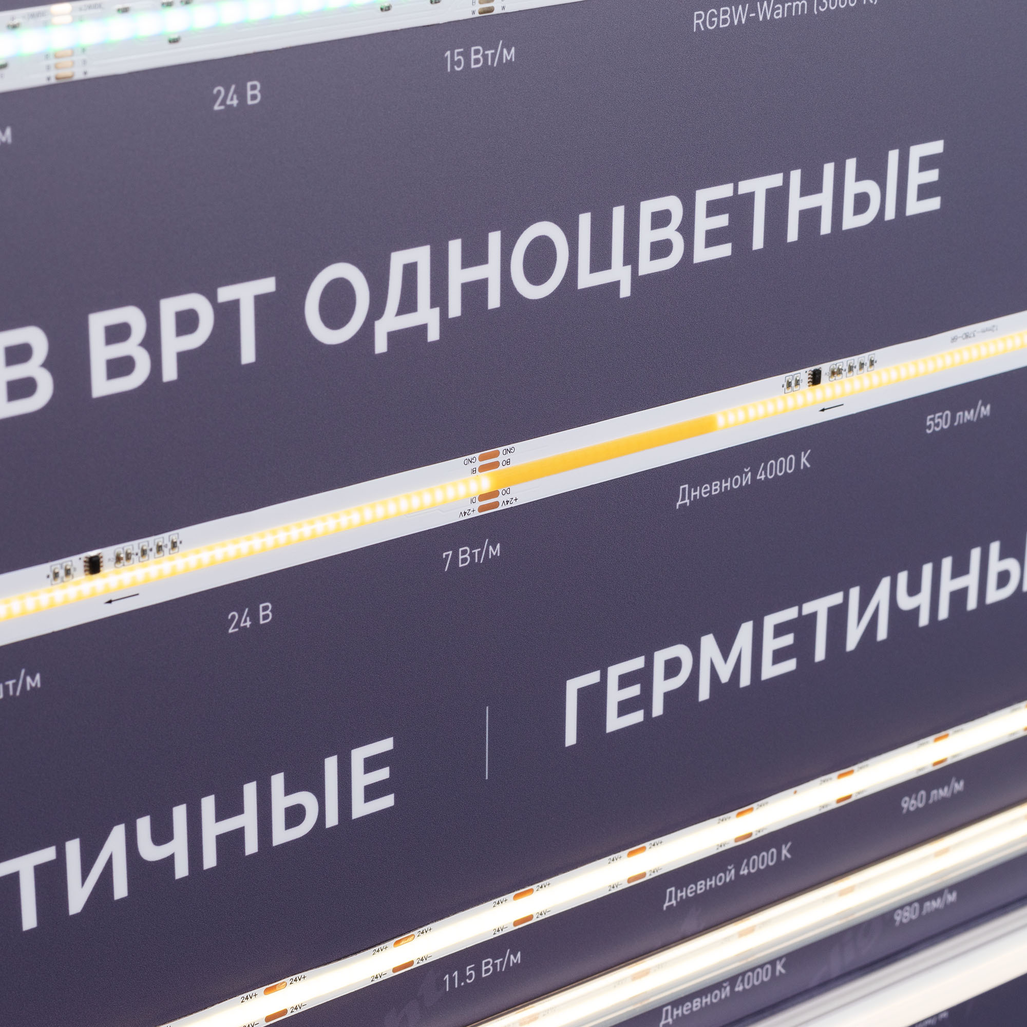 Стенд светодиодные ленты COB. Материал - алюкобонд 3 мм, пленка, печать. Габаритные размеры (Ширина Х Высота Х Глубина), 600х1760х60 мм. Питание 230 В.